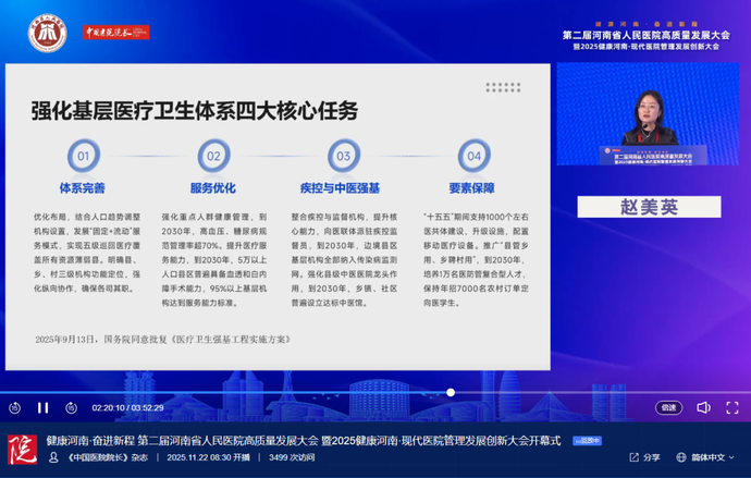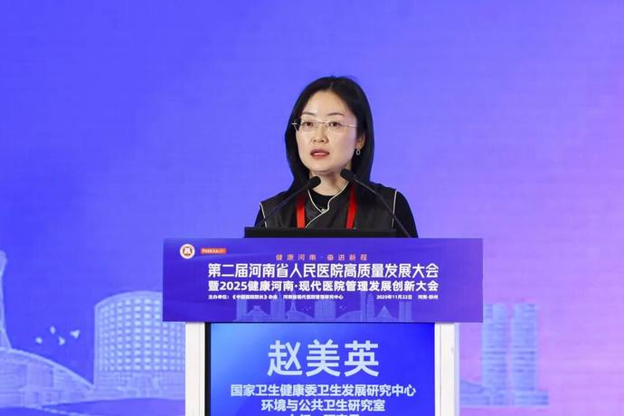 国家卫生健康委卫生发展研究中心环境与公共卫生研究室主任赵美英以《构建优质高效卫生健康服务体系下创新发展路径》为题进行报告。她详细解读了新时代新体系下,医院找准高质量发展的实践路径,指出将健康优先发展提升为医院战略高度,对接群众健康需求,提升重点专病能力。
