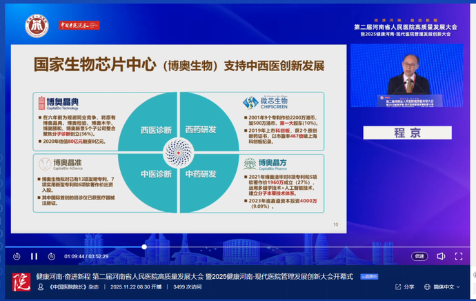 程京以《健康医疗、中西并重》为题带来主旨报告。他围绕遗传性耳聋基因检测、致病性微生物基因检测、AI赋能中医食疗、中医药疗和居家康养之智能陶瓷等方面进行了精彩阐释,明晰了现代技术与传统中医药融合的发展方向。