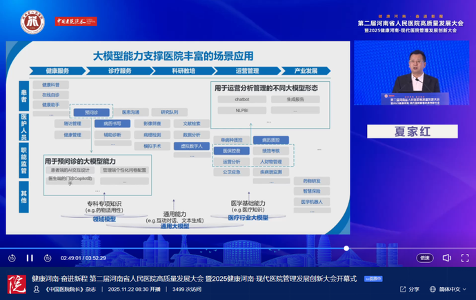 夏家红进行《数智赋能公立医院高质量发展》主旨演讲。他指出,AI能够应用于丰富的医疗场景,助力医院发展,但同时AI技术发展带来了伦理和社会问题,促进AI在医疗领域的健康发展,需要大家携手,共同研究制定相关管理机制。