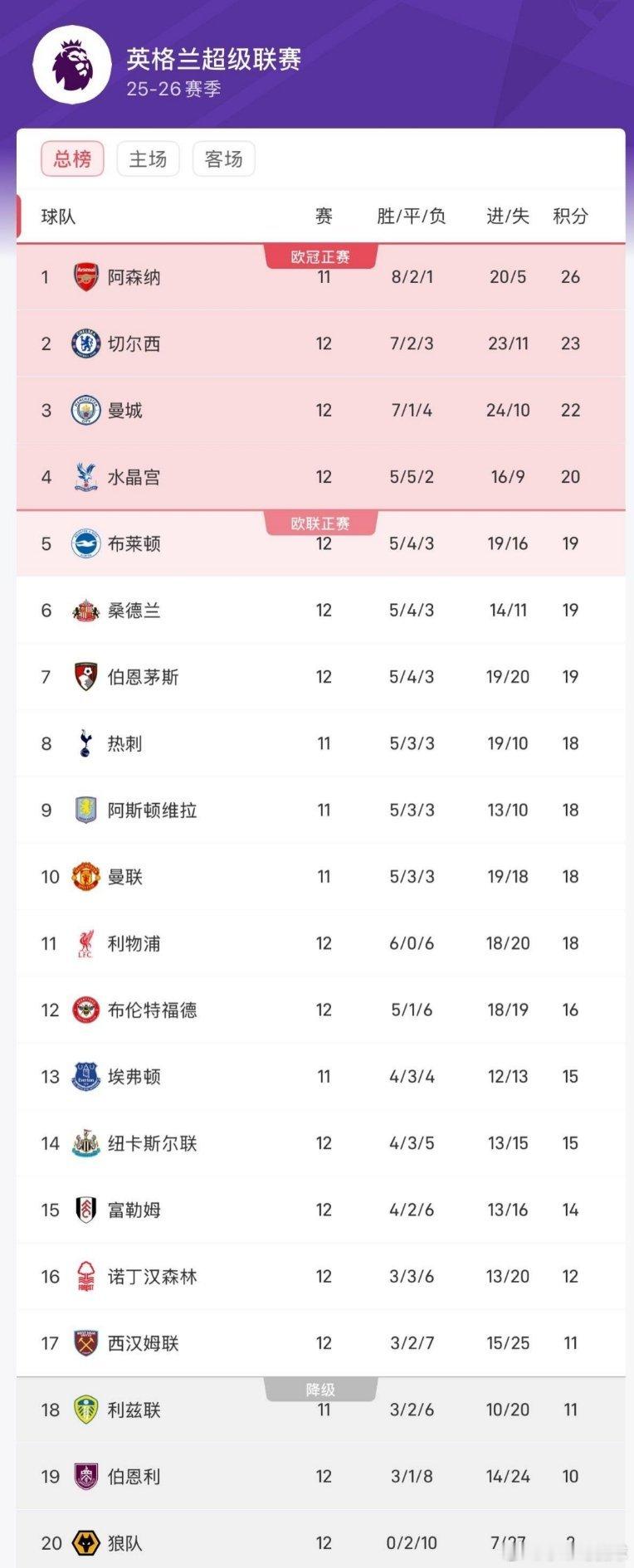 英超第12轮第一比赛日已结束,曼城、利物浦双双输球。利物浦近7场联赛只取得1场胜利,陷入史无前例的低迷,在本轮输给森林后已经跌至第11位。水晶宫2-0击败狼队后跃居第四位,狼队积2分继续垫底。曼城1-2输给纽卡后积分被本轮赢球的切尔西超越,暂居第3位。少赛一场的阿森纳仍以26分稳居榜首。