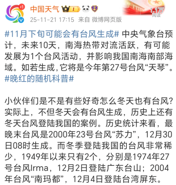 不过,由于冷空气频繁南下,导致无法持续堆积形成强势的冷源,所以从目前的趋势来看,11月下旬出现寒潮的可能性较小。