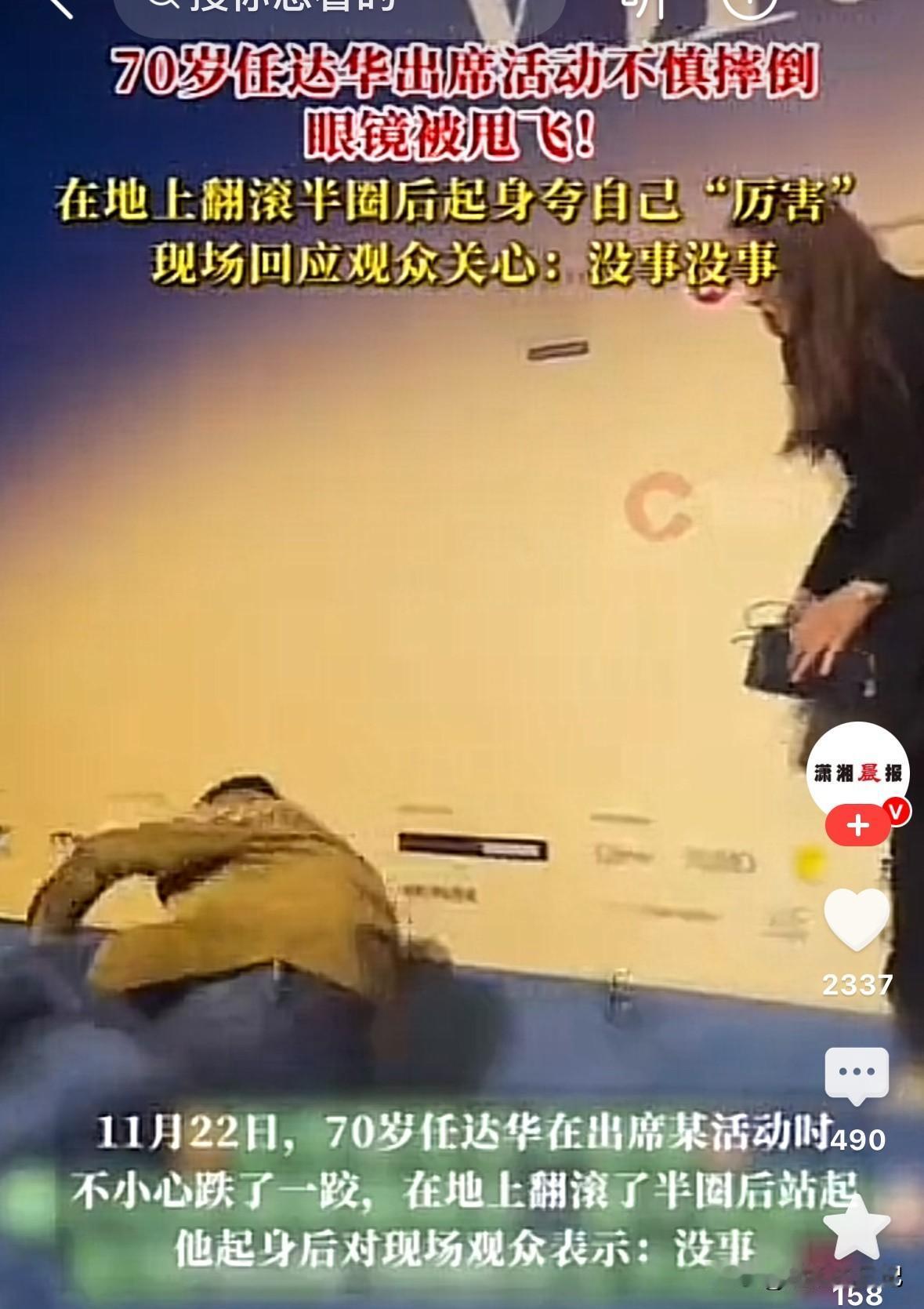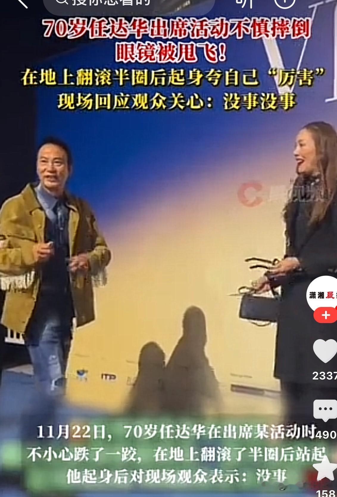 70岁任达华参加活动摔倒,两个没想: 一,70岁的任达华身手如此敏捷, 二,他老婆第一时间不是去扶他,而是去捡眼镜。 任达华已经70岁了,这个年纪摔倒,非常容易出现问题,没想到,任达华居然借势一个翻身,直接起身,不知道的还以为是故意安排的环节呢。 他老婆的第一反应大家有点不懂了,能看出来她有点慌张,想去扶任达华的同时,又缩了回来,第一时间是捡起来任达华掉落的眼镜。 任达华起来后,也是精神头十足,跟大家说,没事,没事。也真是没事。 没想到,他这个年纪,身体还这么灵活,看来平时一定是有锻炼身体了。
