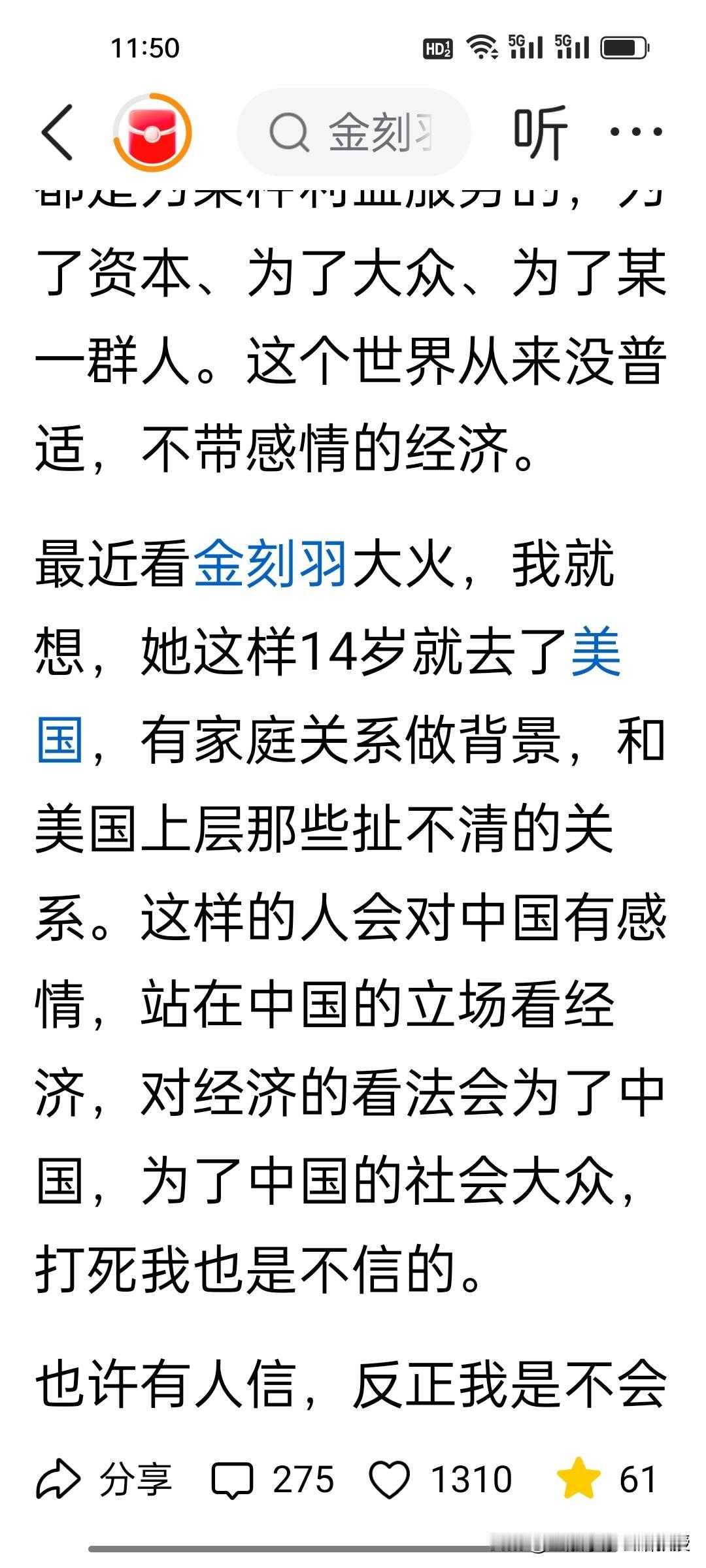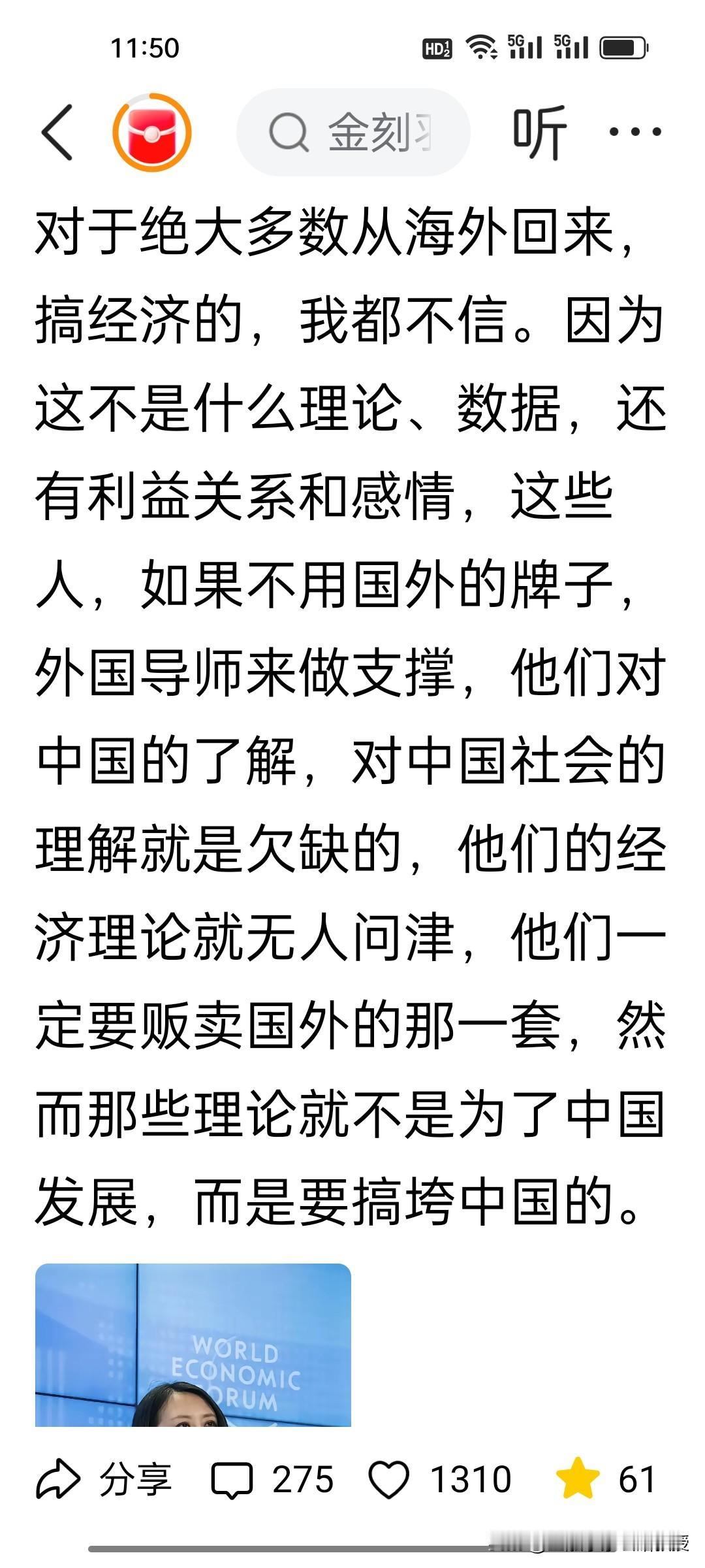 刚刚看到项立刚谈到一个观点,就是他不相信海外回来的经济学家,比如最近很火的14岁就已经赴美的家庭背景复杂的金小姐,项立刚不相信她对中国有感情。 就是这个金again小姐,是美国前财长耶伦访问中国时候,跟耶伦一起圆桌吃饭并拍照的女经济学家之一。她在疫情期间,强调中国必须无条件援助美国。另外,最近一封她与爱波斯坦相关的邮件爆出其与前哈佛大学校长哈默斯的关系,尽管这位金小姐到现在也没有出来澄清。