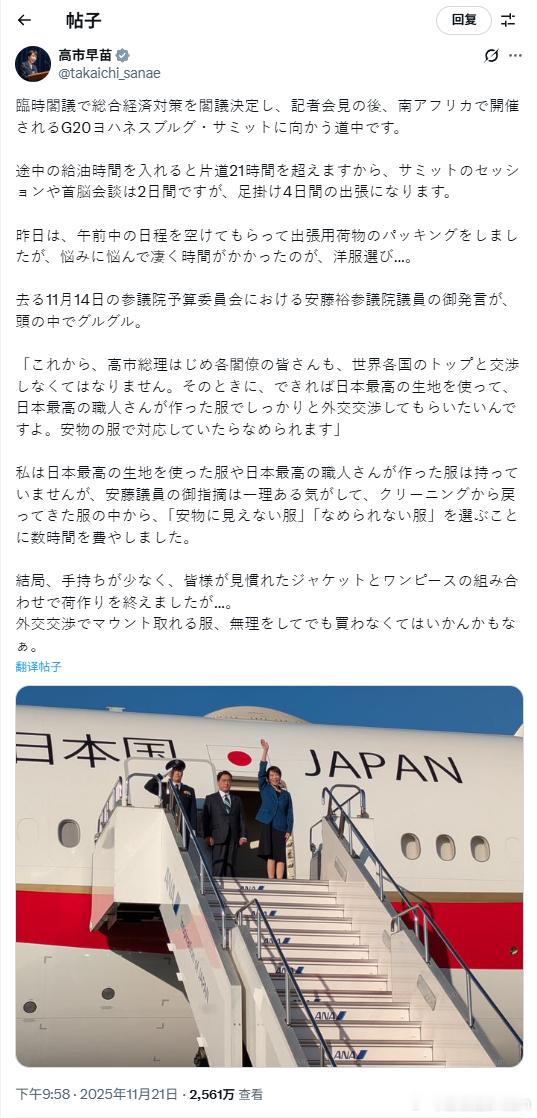 日本首相高市早苗说,穿廉价的衣服会被外国人瞧不起,所以她花了几个小时时间挑选衣服,要穿最好的衣服进行外交谈判。她还特意多买衣服,以便能在外交谈判占据上风。