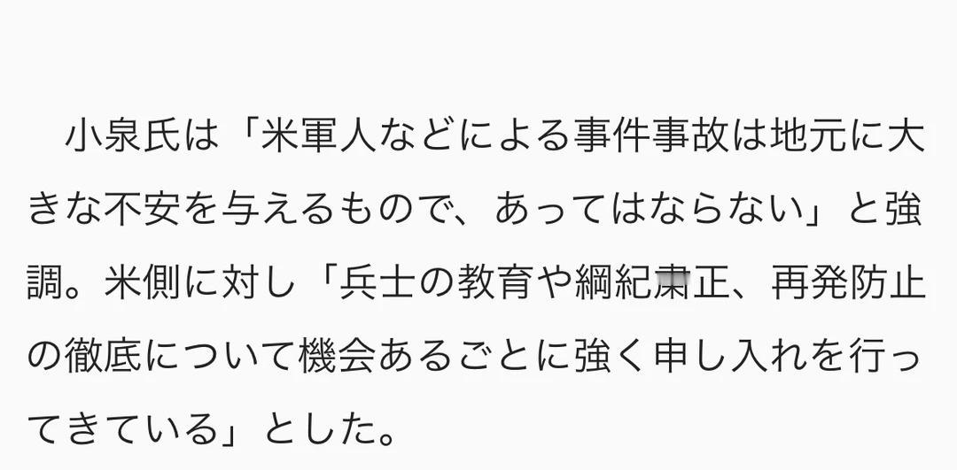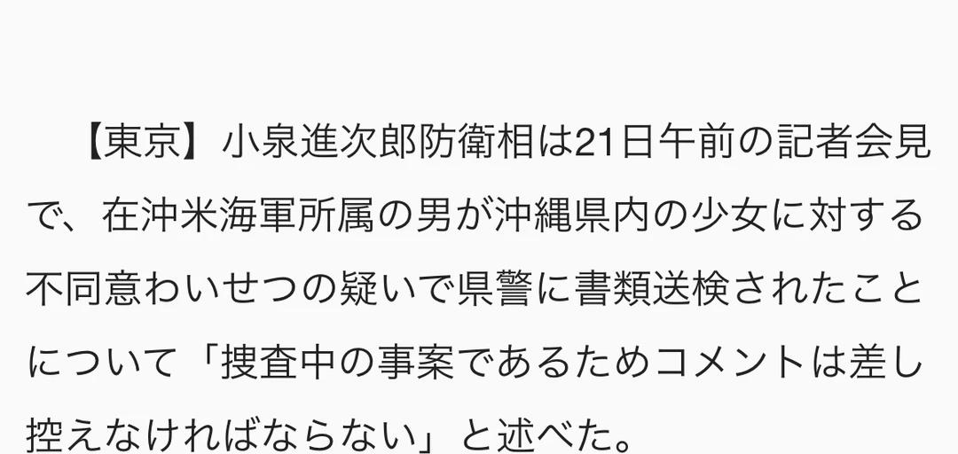 小泉对“美军士兵涉嫌非自愿猥亵”案不予置评 翻译: 小泉防卫相针对“美军士兵涉嫌非自愿猥亵”一案表示“不予置评” 图片说明:正在记者会上回答提问的小泉进次郎防卫大臣 = 21日上午,摄于国会内 11月21日上午,防卫大臣小泉进次郎在记者会上,针对驻冲绳美国海军所属的一名男子因涉嫌对冲绳县内一名少女实施“不同意猥亵(非自愿猥亵)”而被冲绳县警移送检方(书类送检)一事,表示:“由于案件尚在调查之中,对此不予置评(无可奉告)。” 小泉强调:“美军人员等引发的案件及事故会给当地民众带来巨大的不安,这类事件决不该发生。” 他同时表示,针对美方,“一直在利用各种机会,强烈要求其彻底落实士兵教育、整肃纲纪以及防止此类事件再次发生。” 补充一下,不同意わいせつ,即“非自愿猥亵罪”,日本于2023年修改刑法,将原本的“强制猥亵罪”更名为此,不再要求受害者必须有“反抗困难”的证明,而是强调“未经同意”。这通常指涉性质严重的性犯罪。 日本生活 日本