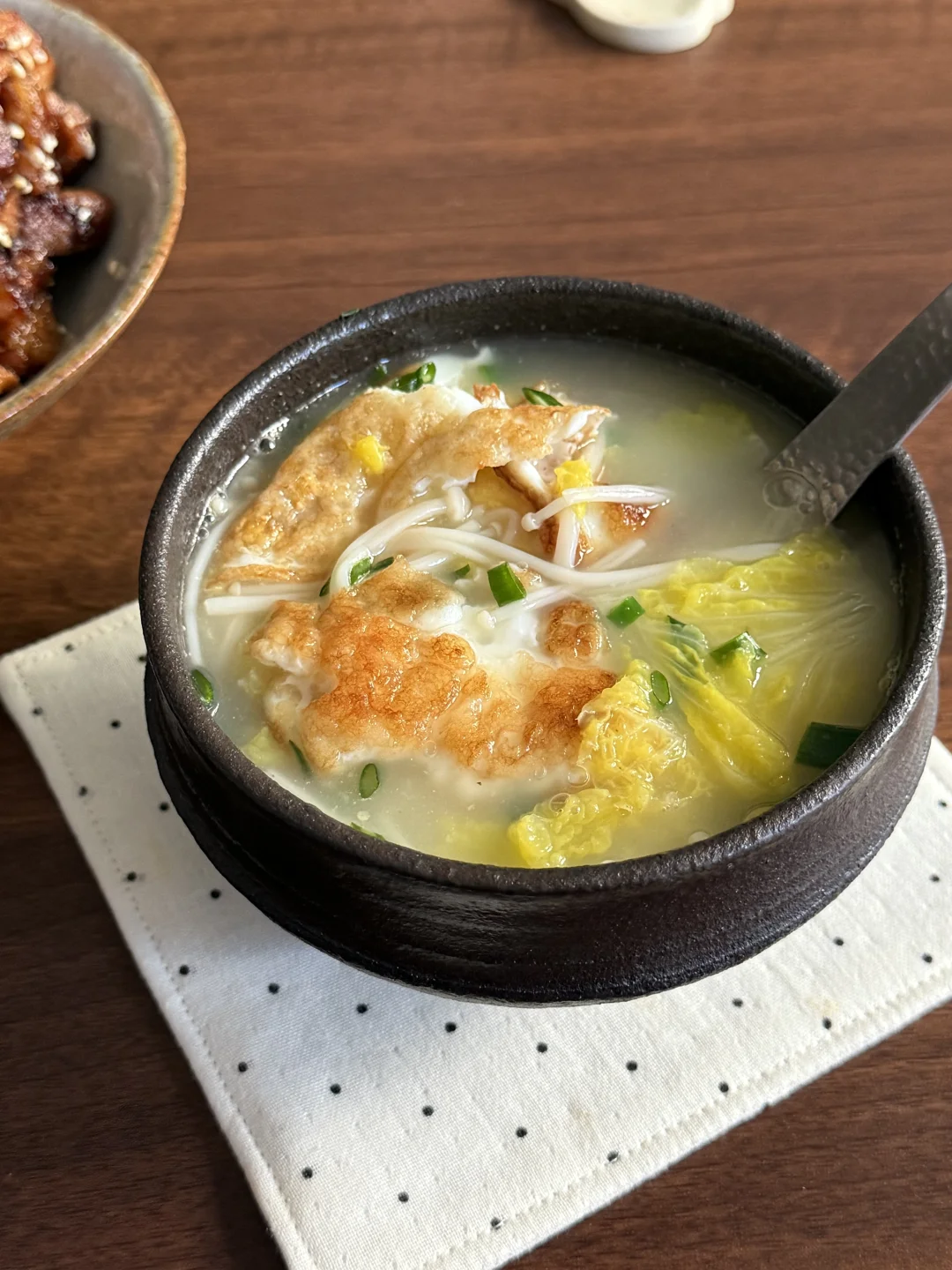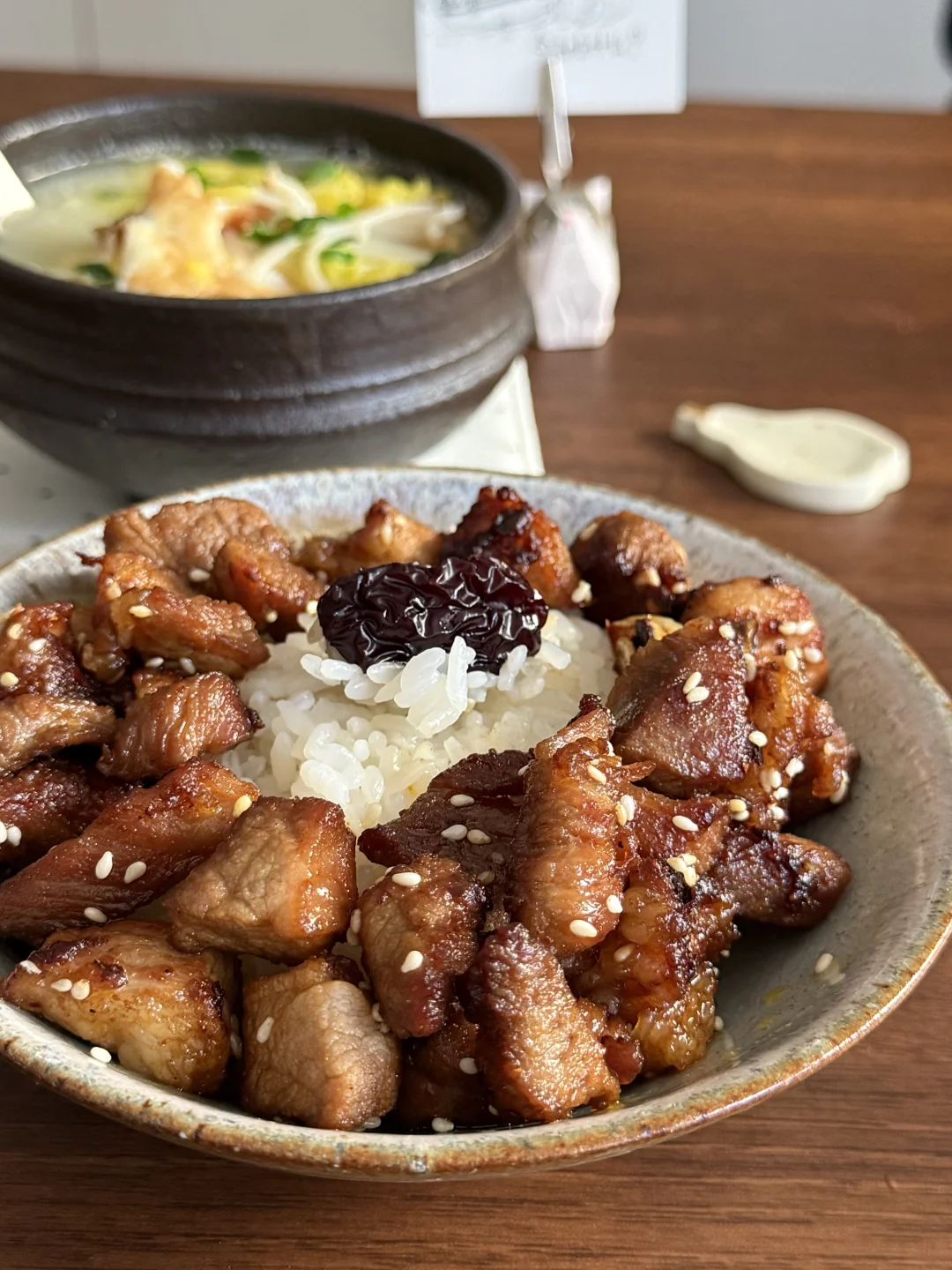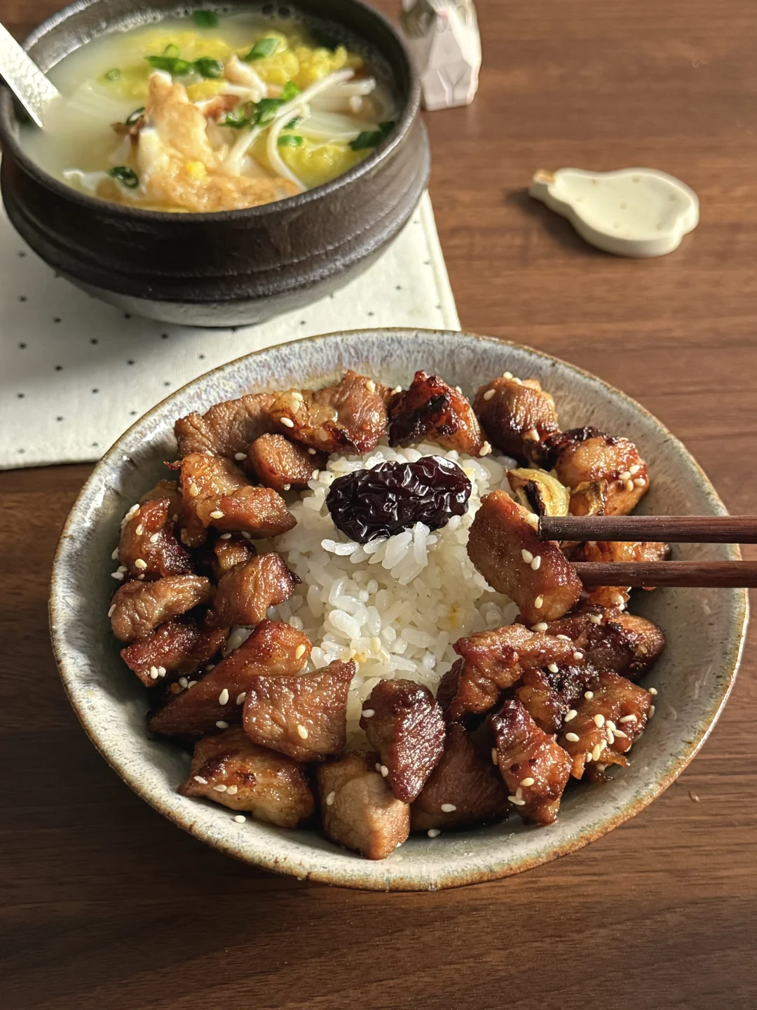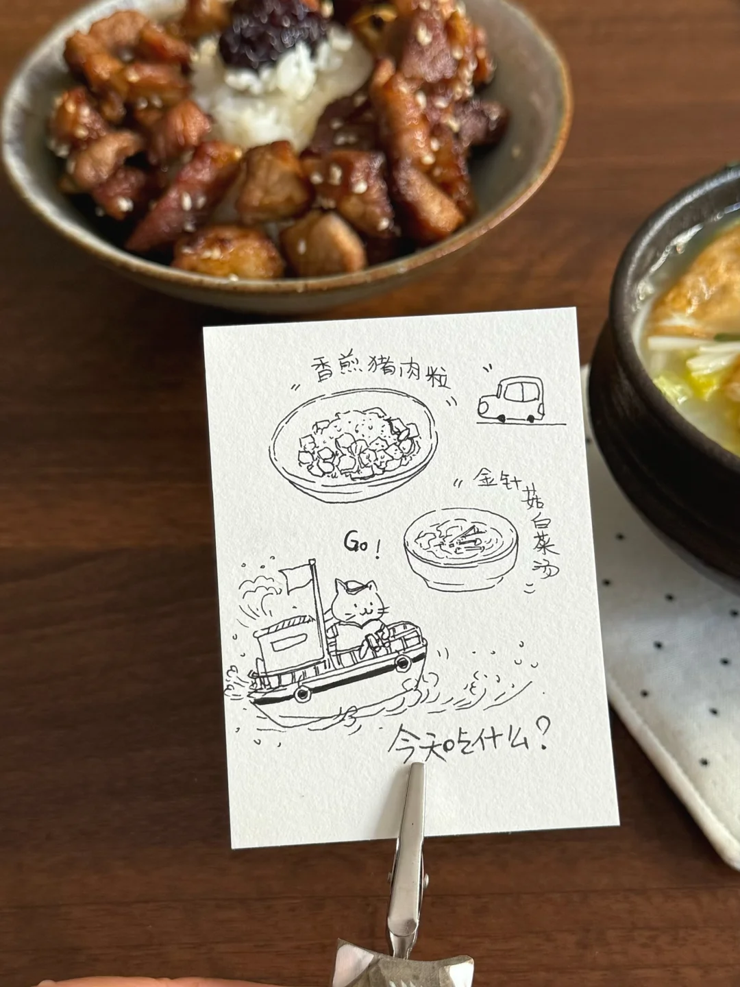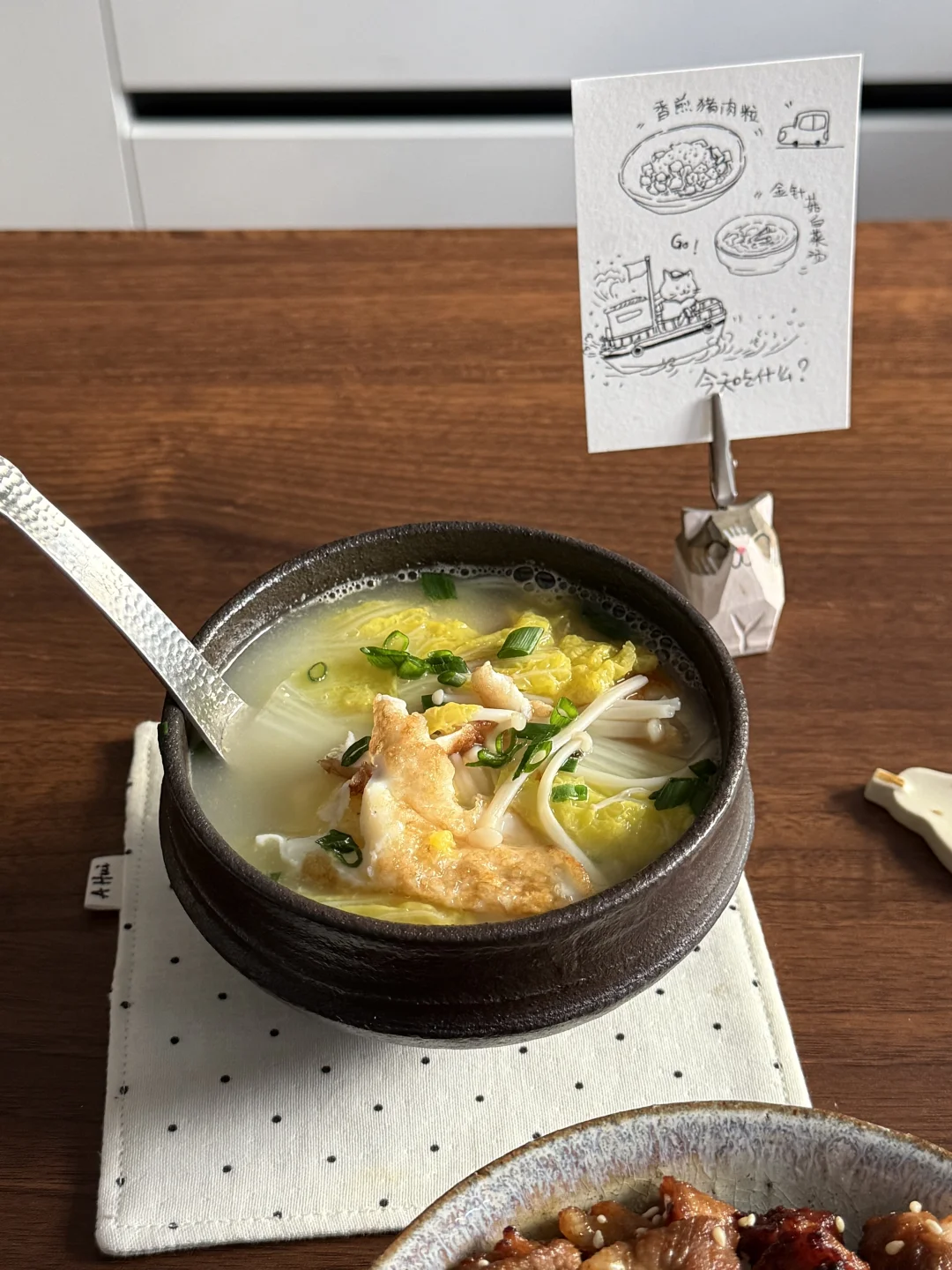 懒得大动干戈,还是简单点吧。 采购肉一块5.5元,白菜一小颗、金针菇一小把,送一棵葱共4元! 🧆香煎梅花肉。 梅花肉用生抽、蚝油、烧烤粉、淀粉稍微腌了一下,下锅煎得焦香。今天时间煎的稍微过了一点点,没那么嫩,但有嚼头了,肉香味足足的。 🥬白菜金针菇荷包蛋汤 这碗汤也简单,煎了个荷包蛋,然后冲入开水,汤色瞬间就奶白奶白的了。再放下白菜和金针菇,简单用盐和鸡精调味,喝下去整个人都暖乎乎的。 吃得舒服,就是最好的午餐。你们今天中午吃了什么呀?