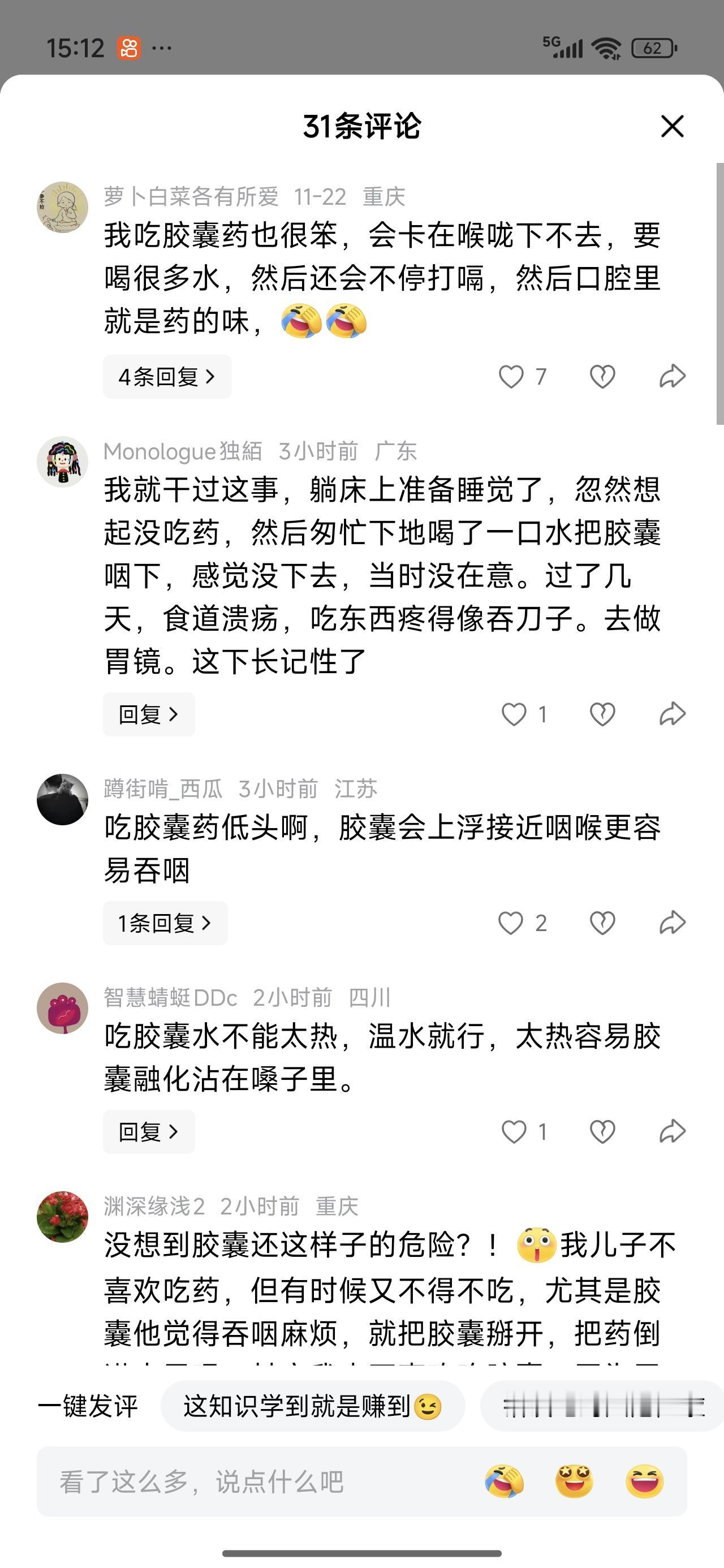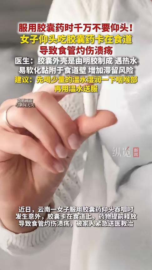 这都能出问题?吓人啊!云南一女子服用胶囊,粘在嗓子眼,药物提前释放,将食管灼伤。 医生提醒,要先喝口水,润一下嗓子,才能继续吃药的动作。 我喜欢吃姜粉用胶囊吃。小黄姜粉太辣了,直接泡水喝送不下去。辣嘴辣舌头,辣喉咙。 真是的。你别说小孩子了,大孩子也容易出各种状况。我朋友家的老大,就是这样子,诊断为碍。多音字哈。吓得她妈快疯了,四处去看,最后说没事了,不是那个。也不知乌龙是怎么回事,不敢深究。就出院了。