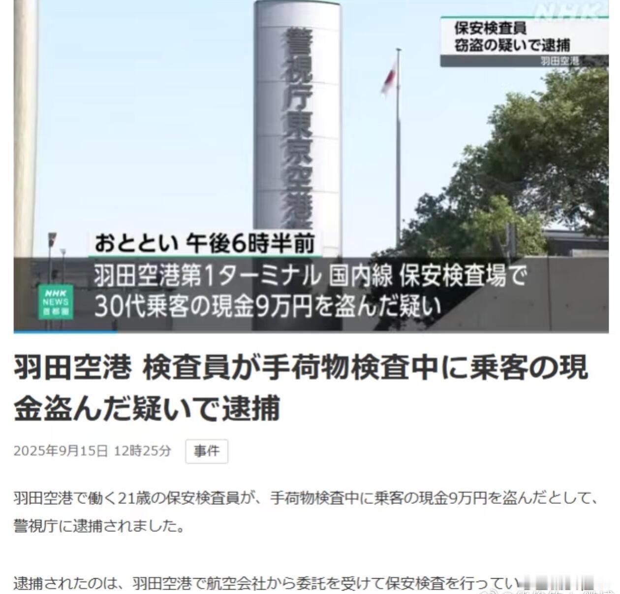 东京机场工作人员盗窃旅客财物。 如图: 日本东京成田机场、羽田机场多名安检工作人