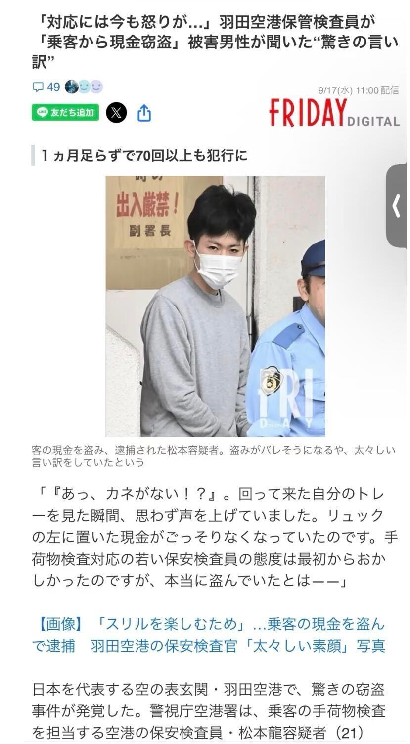 东京机场工作人员盗窃旅客财物。 如图: 日本东京成田机场、羽田机场多名安检工作人员多次盗窃旅客旅行包内财物 请旅日游客注意贵重物品随身携带,加强看管 按照最近的形势,真的别去日本旅游了…… 真没想到日本机场的工作人员也这副腔调…… ​​​