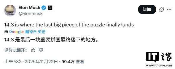 IT之家11月23日消息,特斯拉首席执行官埃隆・马斯克(ElonMusk)在公司向用户推送FSDv14.2版本数小时后,即公开“剧透”了下一重大更新v14.3版本。他称,v14.3将“是最后一块重要拼图最终落下的地方”。