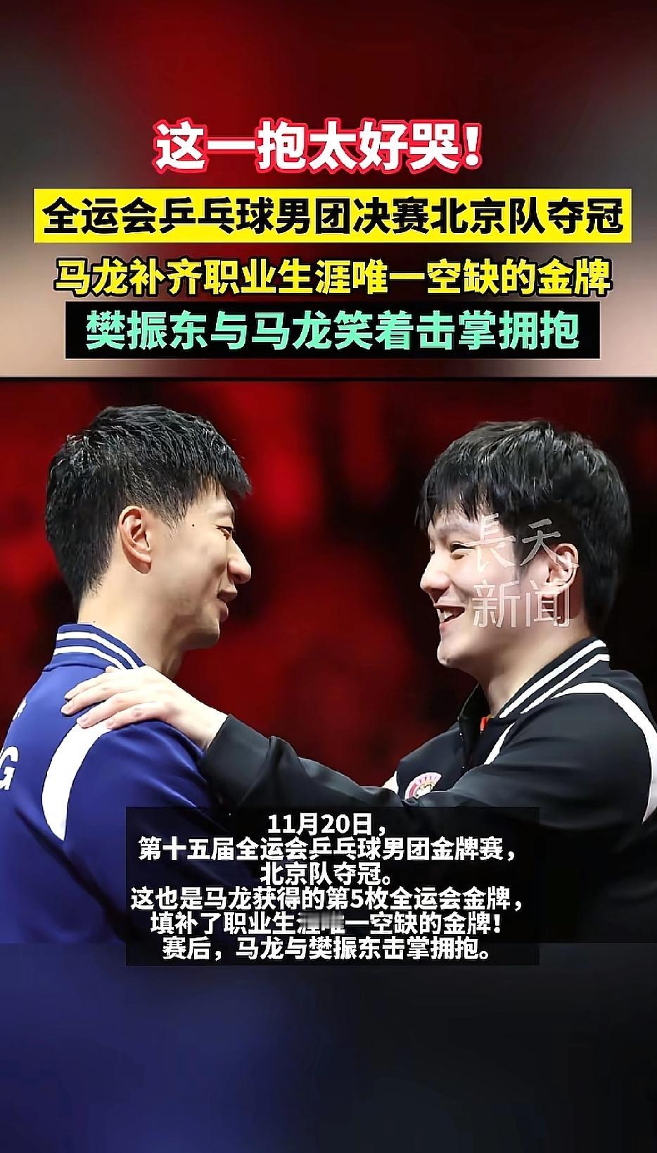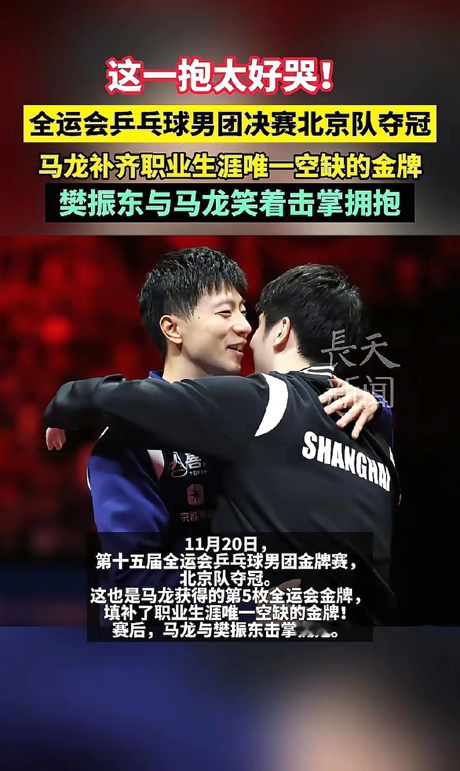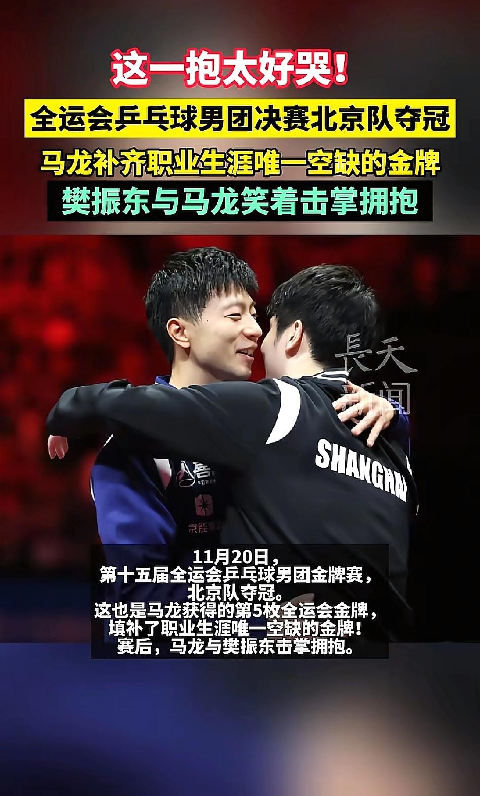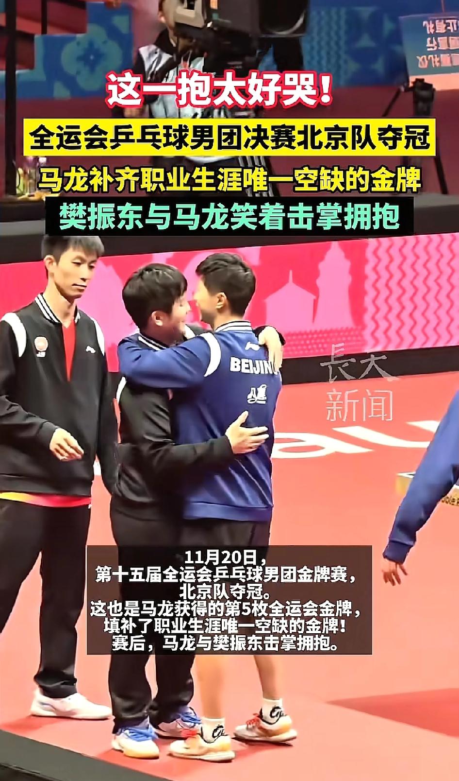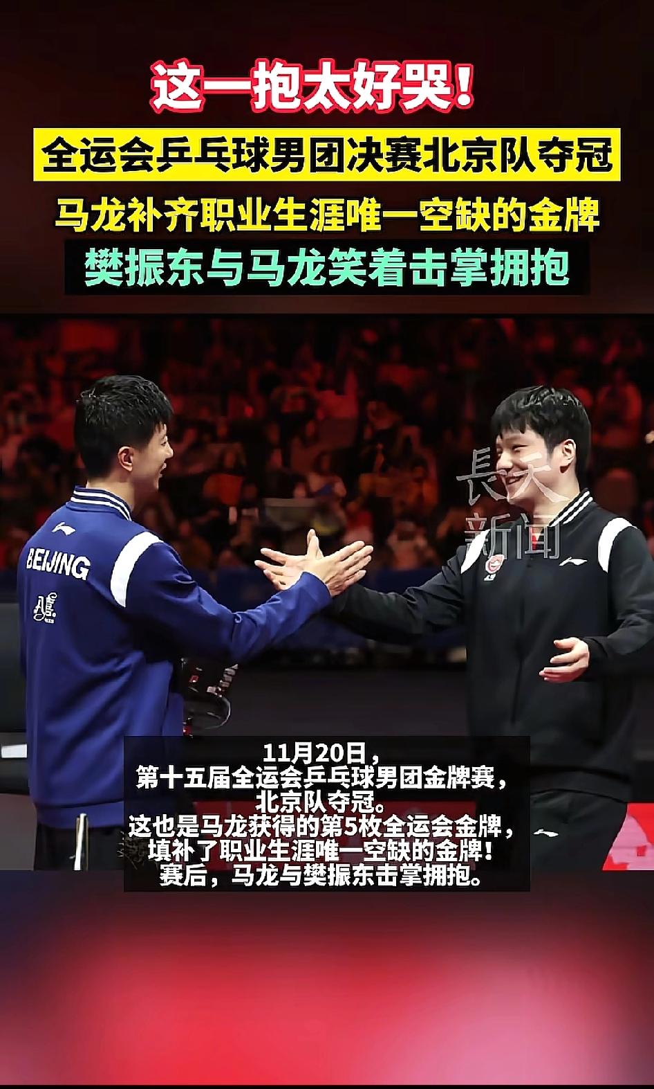 全运会团体赛结束后, 樊振东带着笑容走向马龙, 伸出双手,两人紧紧拥抱在一起,没有说太多的话, 只是笑着说了几句,那一刻,让每一个喜欢他们的人为之动容, 樊振东,这个小时候一直跟随在马龙身后的小屁孩,如今已经成长为国乒的铁血一单,他的能力用网友的话说,可以称得上大宗师的级别了。 前些年,樊振东曾一直困扰在饭圈文化,记得有一次面对采访,他无奈的说,输了不行,好像赢了也不行! 每每看到这句话,心里还是难免刺痛,对于一个运动员来说,打得好或者不好,都不要去伤害。 自从巴黎奥运会结束后,樊振东就暂时停了一停,今年正是加盟德甲,在那里,他不需要想太多,赢了或者输了,都不会有外界的声音干扰他的内心, 记得他在德甲的一场比赛中输给了远不如自己的对手,他曾说自己晚上都睡不着觉,反复的思考到底是哪里出了问题, 正是这样宁静的氛围,让他在这短短几个月内更是成长到大宗师的级别,再次亮相全运会,他在对阵王楚钦的时候,更是打出了让人夸张的比分。 记得他俩有一次采访,马龙说希望小胖下一届奥运会能走的更远,可小胖的一句“他不真诚”却让很多人感到意外, 话题扯远了,以后慢慢聊,最后还是希望小胖将来越来越好! 也祝愿马龙在工作上能顺风顺水!