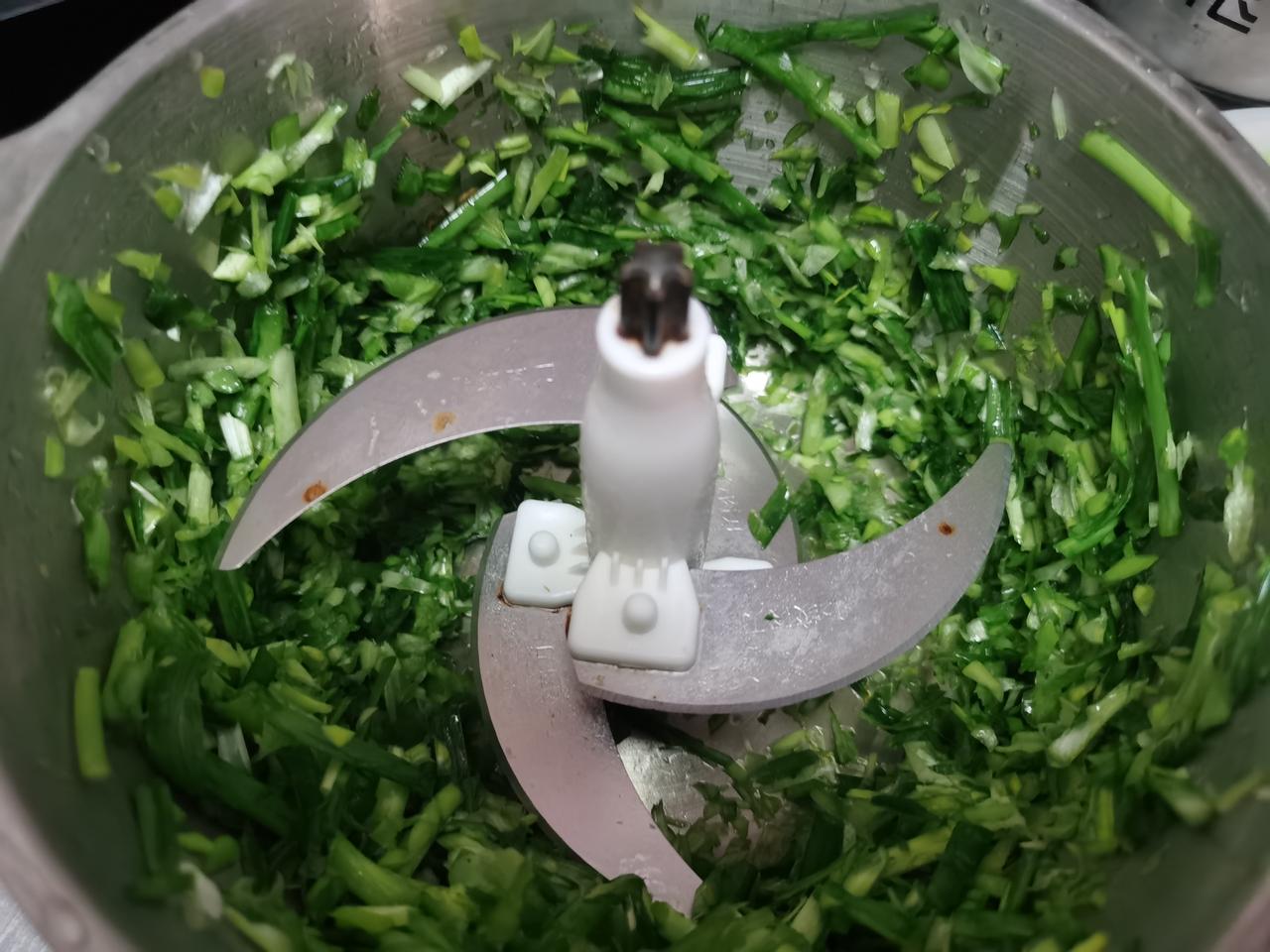 又想吃韭菜的饺子了,然后15块钱买了一斤韭菜,顺便买了些饺子皮回家。 就想着晚上美美吃一顿。 偷了个懒,洗了韭菜晾干,把韭菜放绞馅机里了,然后就绞成这样了,再过几秒钟估计能给打成泥[笑哭][笑哭] 还好我只是放了一点尝试了下,果然韭菜、茴香类的还是要自己动手切[流泪][流泪]。。。