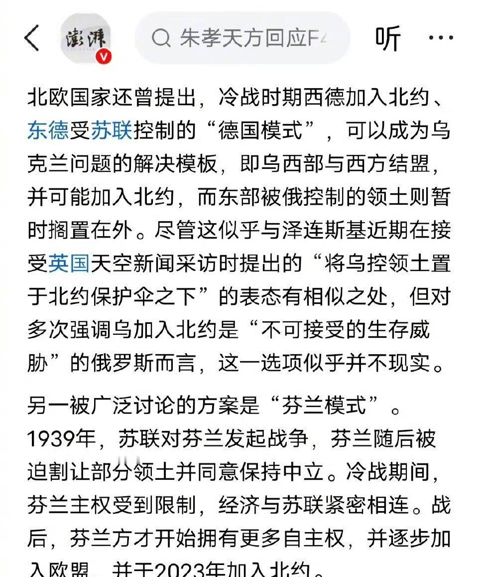 解决俄乌冲突,目前有三种模式: 韩国模式,就地停火,美国在乌克兰驻军。 德国模式,就地停火,乌西加入北约。 芬兰模式,割让领土,保持中立,不能加入北约,不能驻军。 泽连斯基希望是韩国模式,但是,特朗普的28点和平计划很明显是芬兰模式。 ​