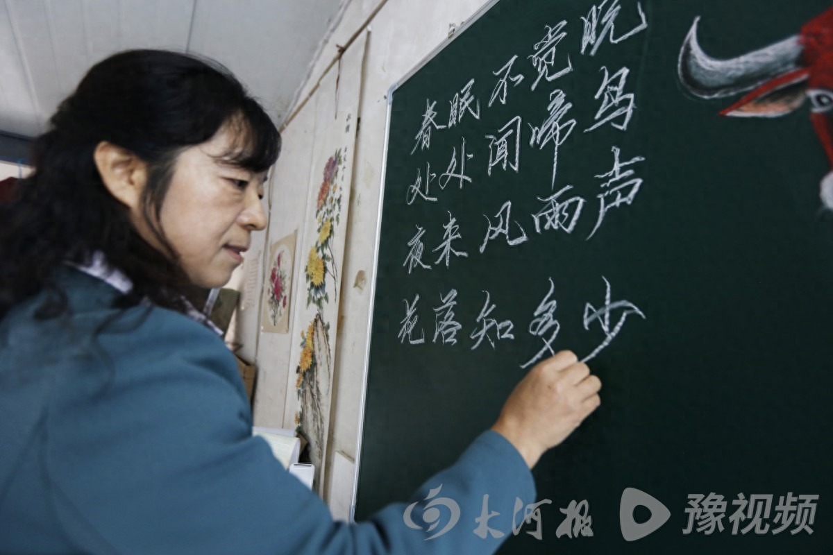 在她的工作室内,大河报·豫视频记者看到有不少粉笔书法和绘画作品,古诗词、名言名句通过多种形式的书法字体得以展示,就像网友热赞的那样,跟“打印机差不多”。而人物、花鸟等形象,也都在她笔下都栩栩如生,健壮的红牛、优雅的孔雀都可以在她的创作下跃然“黑板”上。