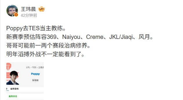 媒体人谈TES新阵容:哥哥可能前两赛段修养 滔搏外战不一定能看到