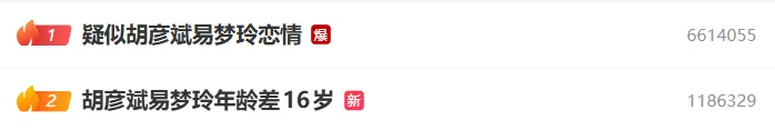 此前,11月19日,话题“疑似胡彦斌易梦玲恋情”登热搜,两人相差16岁。