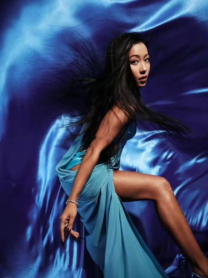 这套蓝色透视抹胸裙设计感十足,细节处理十分考究。通过巧妙的内衬与剪裁,既保证了舞台安全,又最大化展现了服装的美感,让她在舞台上可以尽情释放魅力。