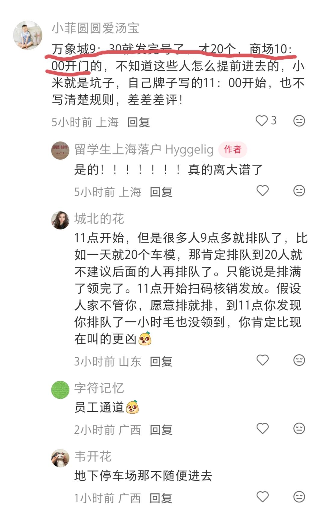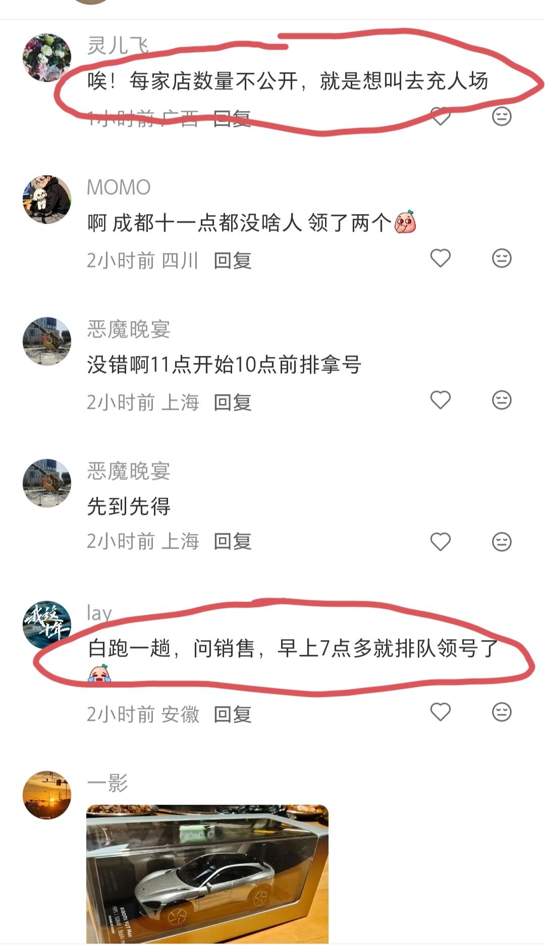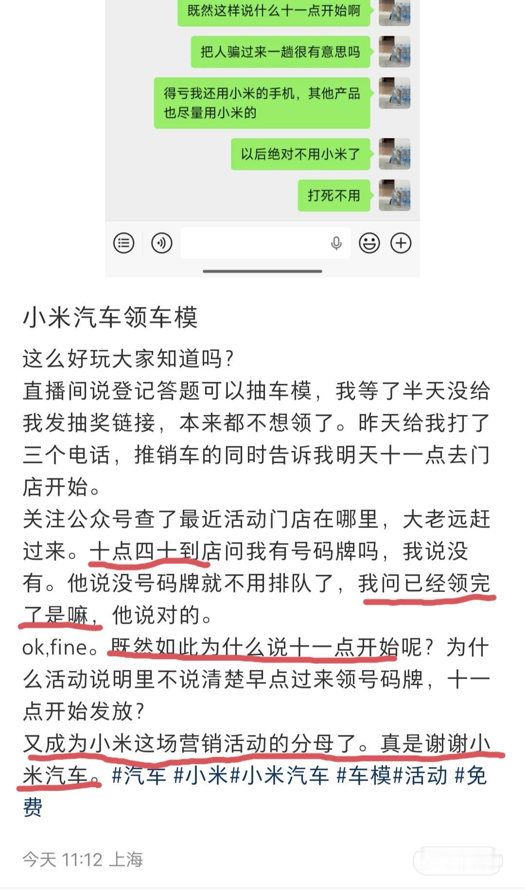 小米汽车在全国400多家门店免费送车模,搞到最后,却成了吃力不讨好。引得众多网友在各大平台发文吐槽。 上海网友说:说好的11点,10点40过去说号已经没有了。又成为小米这场营销活动的分母了。 内蒙古呼和浩特的网友说:前一天号就发完了。开门就说没号了。 包头的网友说:他第一个到店,说发完了。 有网友道出了个中真相:每家店数量不公开,就是想叫你们这些冤大头去充人场。耽误了好多时间,去抢一个几十块的小车模,关键绝大部分都没有抢到。貌似这个送车模的活动人家下了血本,搞得大张旗鼓,可给他仔细算下来,就可能几十到一百万的成本。真的是不得不佩服小米的营销水平,花小钱又办了一件大事!