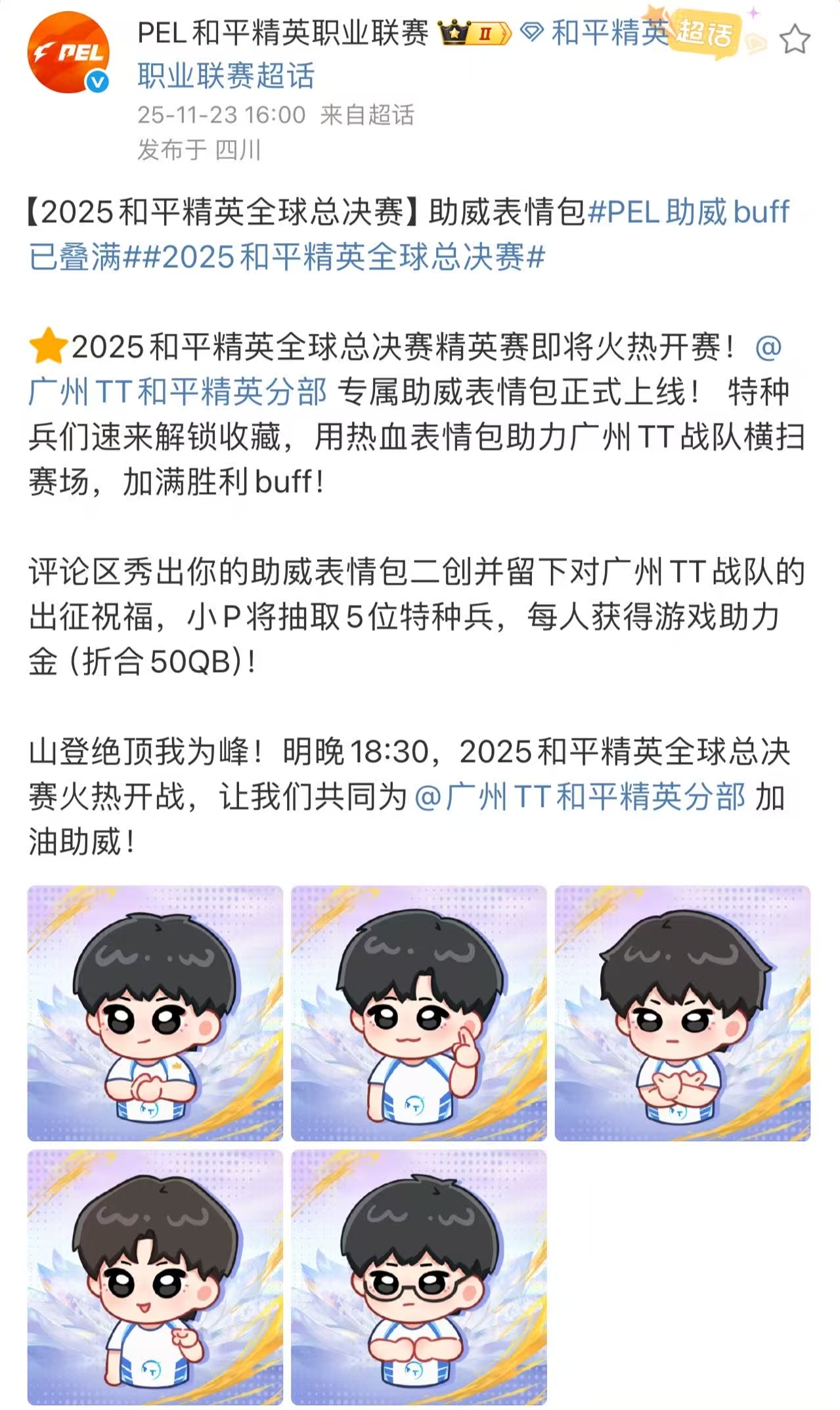 巅峰对决即将上演!为率先出战的TT战队加油,为PEL赛区喝彩,祝选手们发挥巅峰实力,笑傲全球赛场!