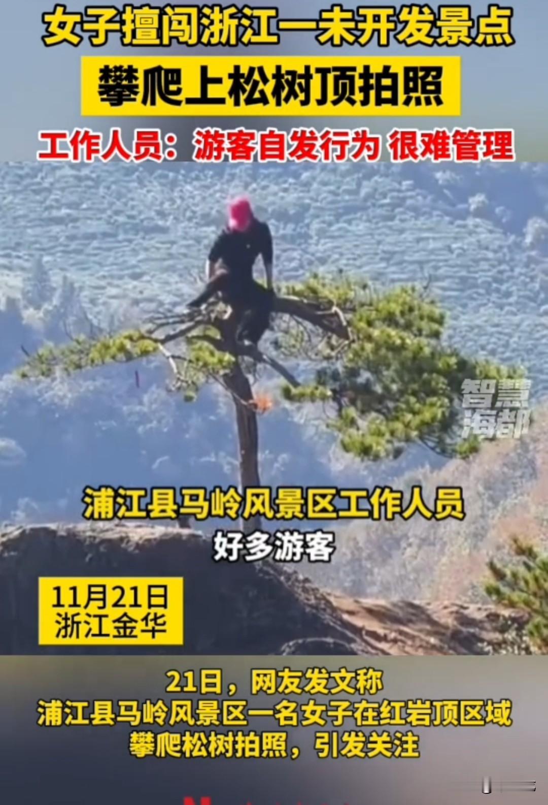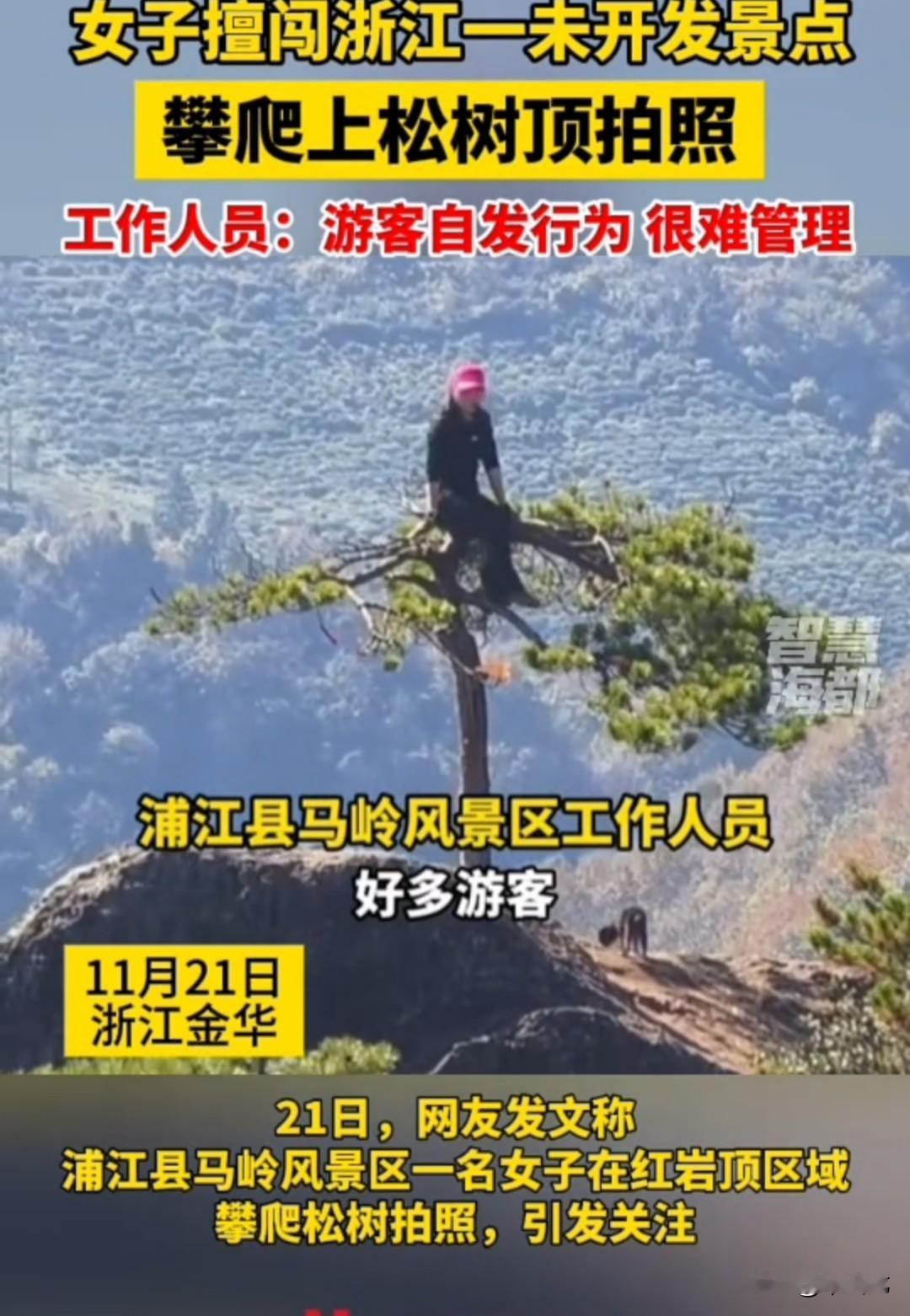 这段站在悬崖松树顶端的视频,终于满足了女子的虚荣心:火爆全网,成为无人不知的网红。 只是以这种不文明的方式出名,你觉得真的好吗? 让你的子女看看,你的妈妈给你们长脸了。 女子擅闯浙江一未开发景区,私自攀爬山顶松树打卡。 从视频中可以看到,这棵松树孤零零地长在山顶,目测距地面起码有两、三米高。 乍一看,跟黄山那棵举世闻名的迎客松颇有几分相似,只是这里无人管理,一些网红就把它当成了拍照打卡的首选地。 看着你颤巍巍地坐在树梢上,对着镜头露出标志性的笑容,你想过没有,拍这段视频的代价是什么。 一旦狂风刮来,或者树枝被压断,或者不慎踩空,掉下去可能就要付出生命的代价。 你自己作死就算了,景区也要跟着你倒霉。 到时候亲属肯定要来讹景区:为什么不在松树旁边设立警示牌和围栏,为什么不派工作人员站在一旁阻止? (素材来源:海峡都市报)
