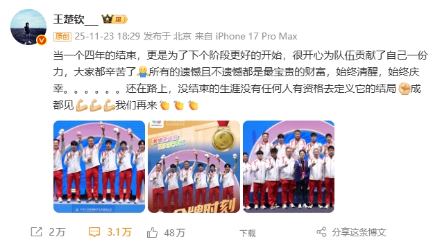 王楚钦写道:当一个四年的结束,更是为了下个阶段更好的开始,很开心为队伍贡献了自己一份力,大家都辛苦了所有的遗憾且不遗憾都是最宝贵的财富,始终清醒,始终庆幸......还在路上,没结束的生涯没有任何人有资格去定义它的结局。成都见,我们再来