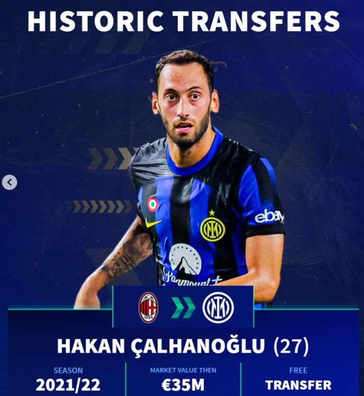 恰尔汗奥卢(米兰→国米),27岁,21-22赛季,身价3500万,自由身转会