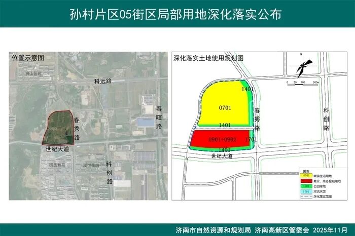 孙村片区05街区局部用地深化落实涉及地块位于济南高新东区,孙村片区,世纪大道以北,春秀路以西,原商业用地调整为城镇住宅用地、商业和商务金融用地、公园绿地,同时在居住用地与商业、商务金融用地之间增加东西向城市支路。