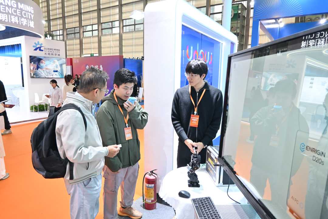 AI一体机“最强大脑”秒算千亿级数据、机器狗巡馆、人形机器人“握手、比心、鞠躬”一条龙……走进罗湖展区,由深圳江原科技有限公司、深圳市捷视飞通科技股份有限公司等企业带来各类产品科技Buff叠满,吸引众多观众驻足。
