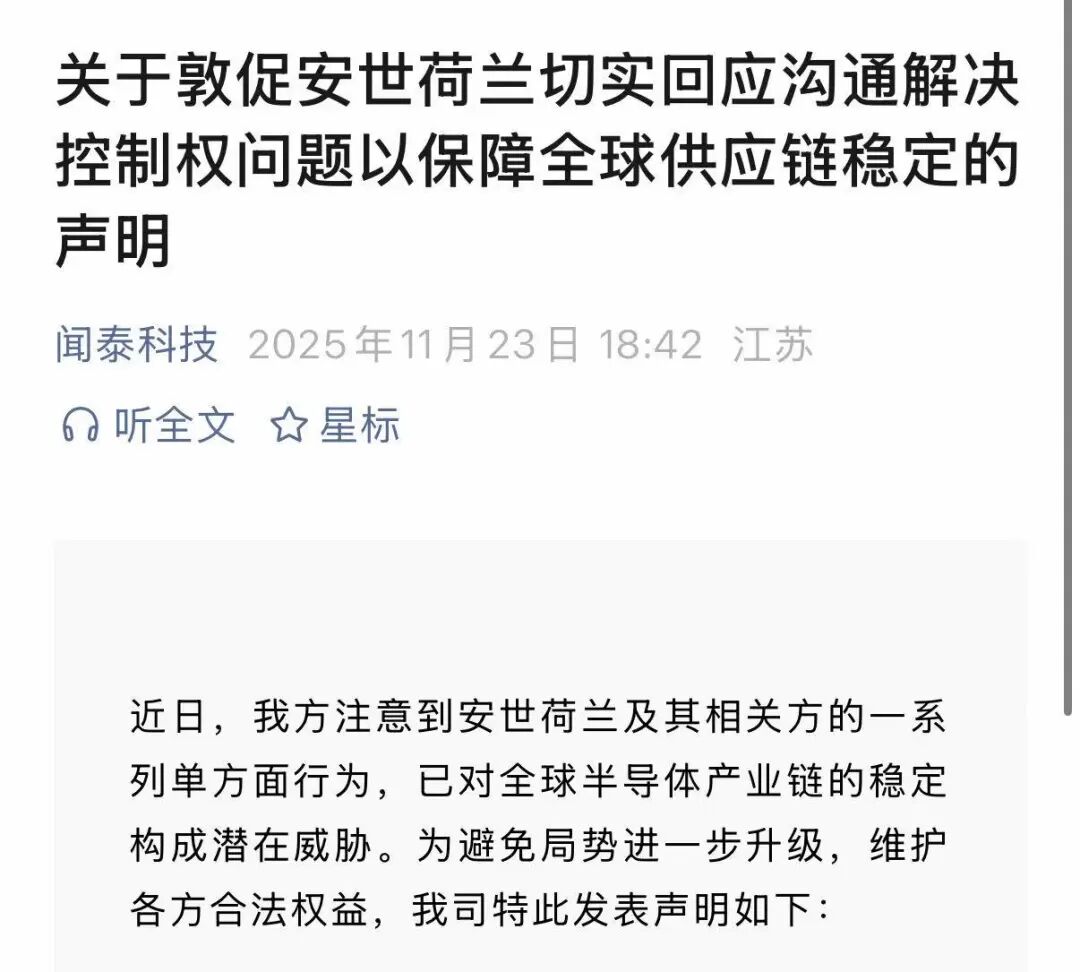 闻泰科技消息,近日,我方注意到安世荷兰及其相关方的一系列单方面行为,已对全球半导体产业链的稳定构成潜在威胁。为避免局势进一步升级,维护各方合法权益,公司特此发表声明如下: