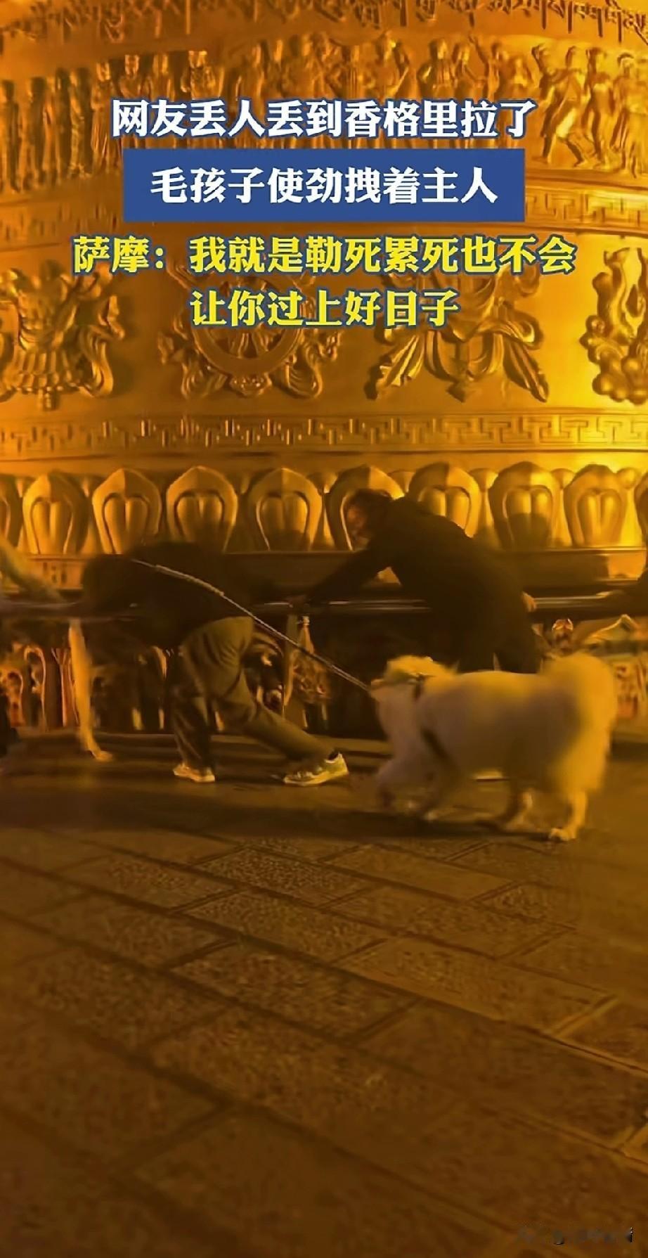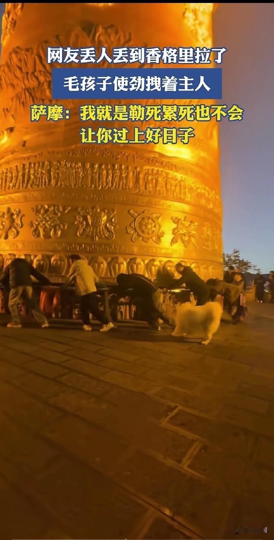 男子带着自己的萨摩犬去香格里拉旅游,看到了超级大的磨盘, 听人讲转这个摸盘可以给自己带来好运,看着这个金色的磨盘, 男子也是宁可信其有, 于是拉着自己的萨摩, 走向了黄金磨盘, 很多游客都去转动它, 男子将萨摩犬的绳子绑在了身上, 然后拼尽了全力去转动, 再过萨摩犬也不老实, 开始猛的拽绳子, 向相反的地方使力, 这样就让男子很难转动磨盘, 周围的人都被看笑, 萨摩犬仿佛在说我就是嘞死了也不能让你富贵, 网友表示真是丢人丢到香格里拉! 大家对于萨摩犬和主人使相反的力气阻止主人转动黄金磨盘怎么看? 香格里拉 每人推荐一个旅行目的地 萨摩耶狗狗