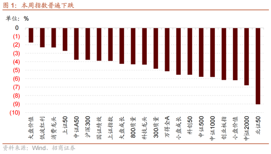 11月17日至21日,指数出现了本轮自四月反弹以来最大单周跌幅,上证指数单周跌3.9%,沪深300指数单周跌3.8%,WIND全A指数跌5.1%。小微盘风格大幅调整,中证2000指数大跌6.8%。