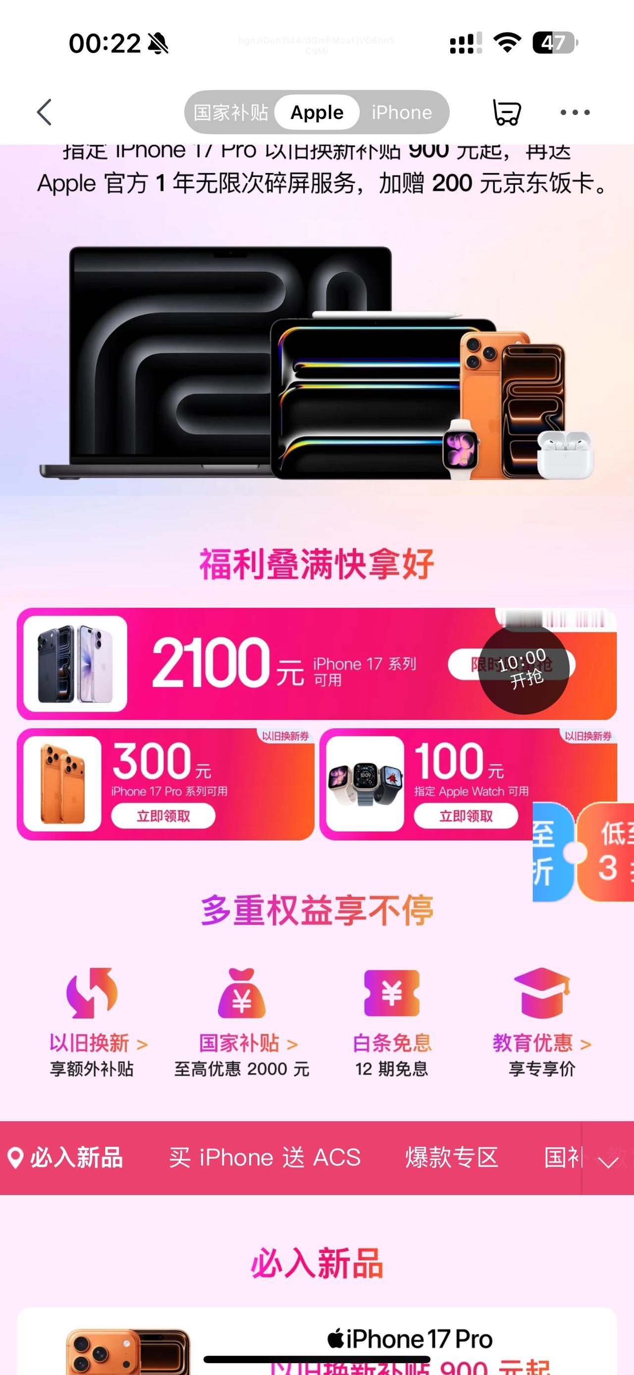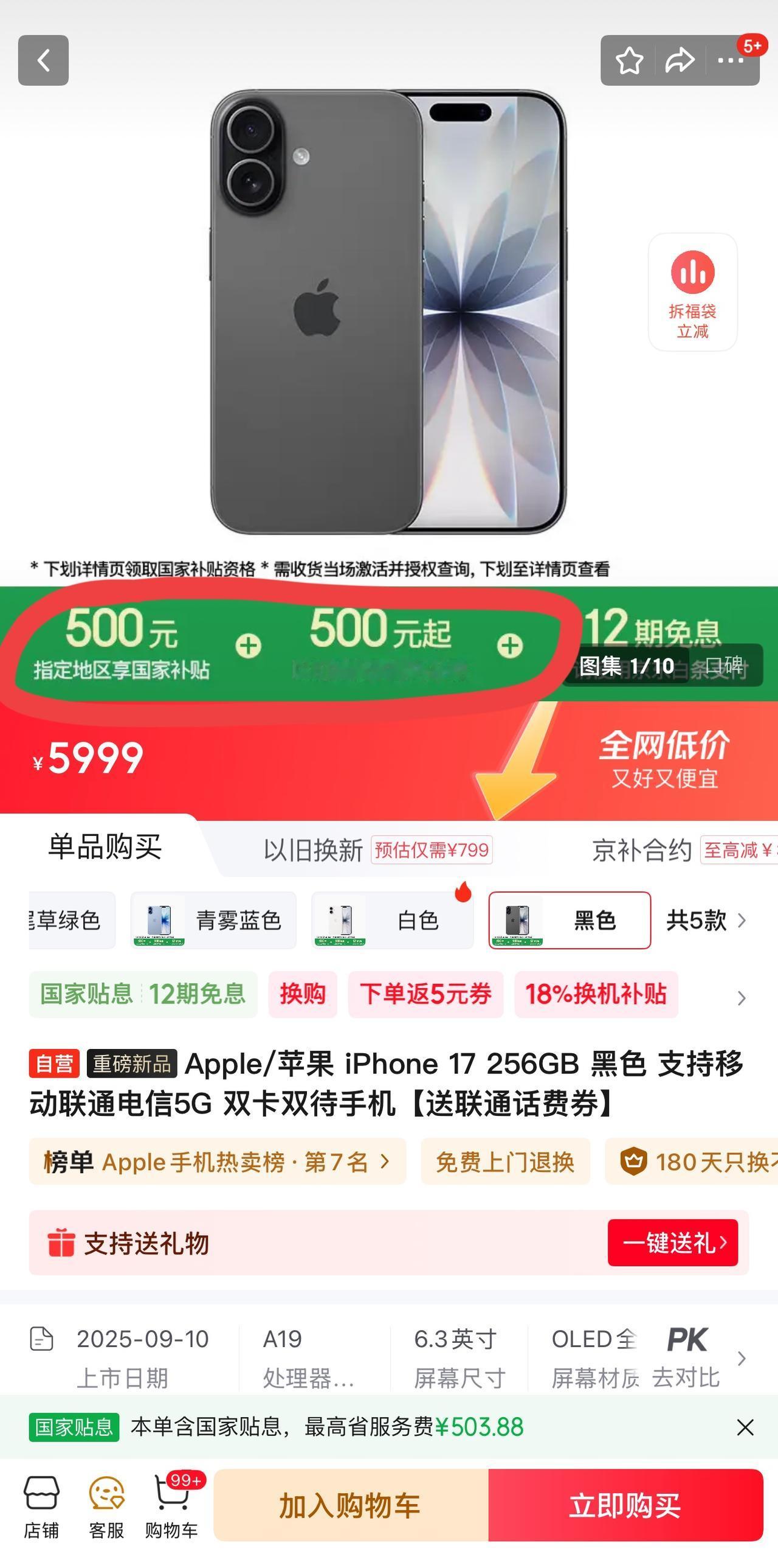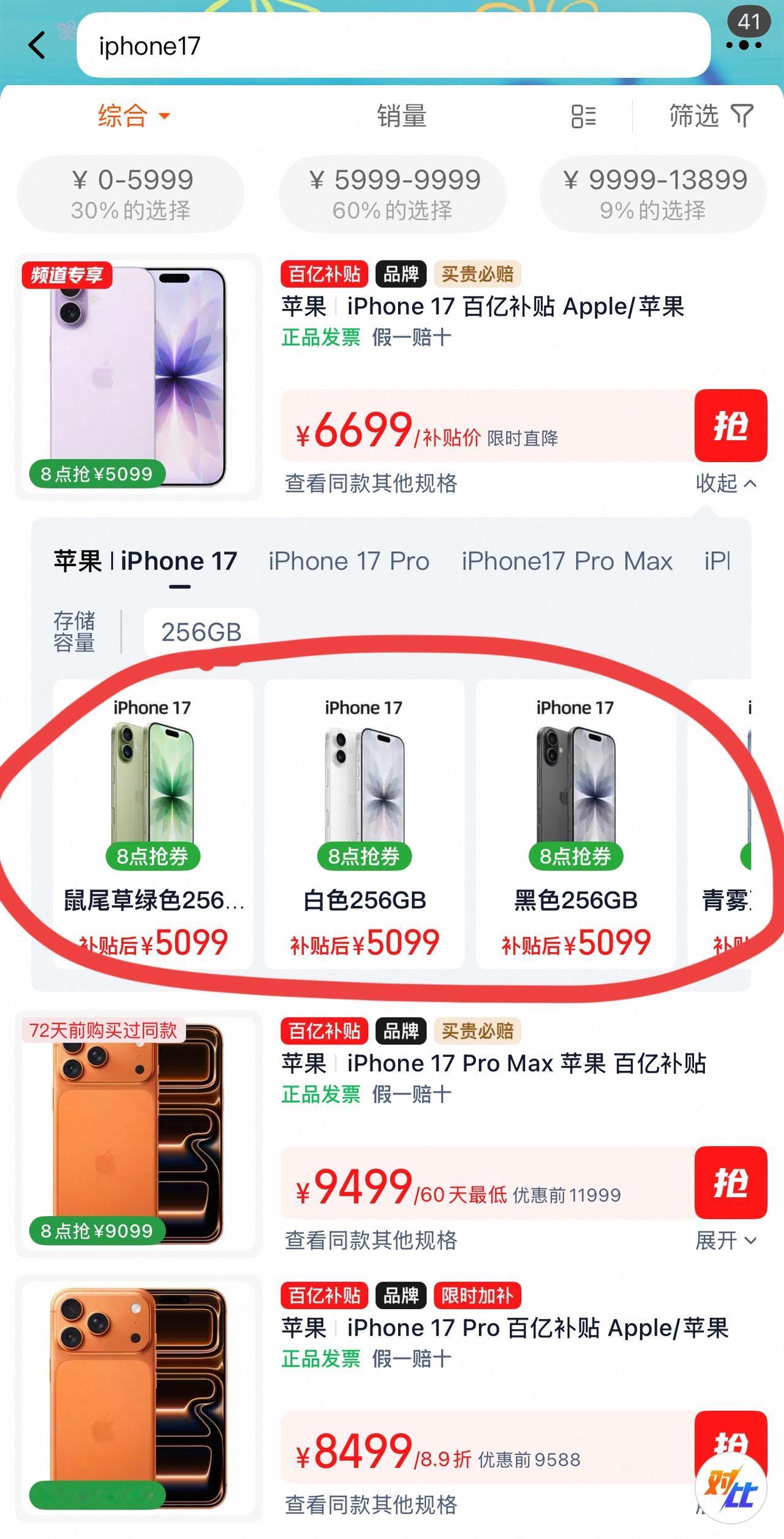 iPhone17价格已经守不住了 5099价格购买汇总,最后一个方法的补贴,不需要看号和资格,地区对任何人都能参与 1、淘宝百亿补贴偶数点抢购5099元 从早上8点开始,每隔两个小时都会有一次大额券,需要蹲点去抢。当然淘宝比较看号,比如号黑的可能就一直给你说前方拥挤请稍后再试。因为我经常买东西,所以我的已经买过了,现在再看就是已经购买上限... Tips:不要多设备登录同一账号,这是号黑的一个关键点! 2、京东指定地区国补+以旧换新补贴,总共优惠1000元,也就是4999到手iPhone17标准版(256GB) 其中国补是部分地区,包括图中显示的12个地区。这个优惠就不说了,然后以旧换新是所有人都可以搞的,需要旧机满400,补500... 3、山姆线下店,人人都可以搞,能5000左右入手iPhone17(256GB) 需要山姆会员,自己的亲友的都可以,如果都没有,那就找店员协助办理一个临时购物资格。然后门店里的iPhone17标价为5898元,直接问店员申领500元手机国补。然后付款时用云闪付、或者什么银行信用卡还能再打折,下单价在5100± 但是注意跑空一趟,去之前先打电话确认一下是否有货,以及当地的具体政策哈[狗头]