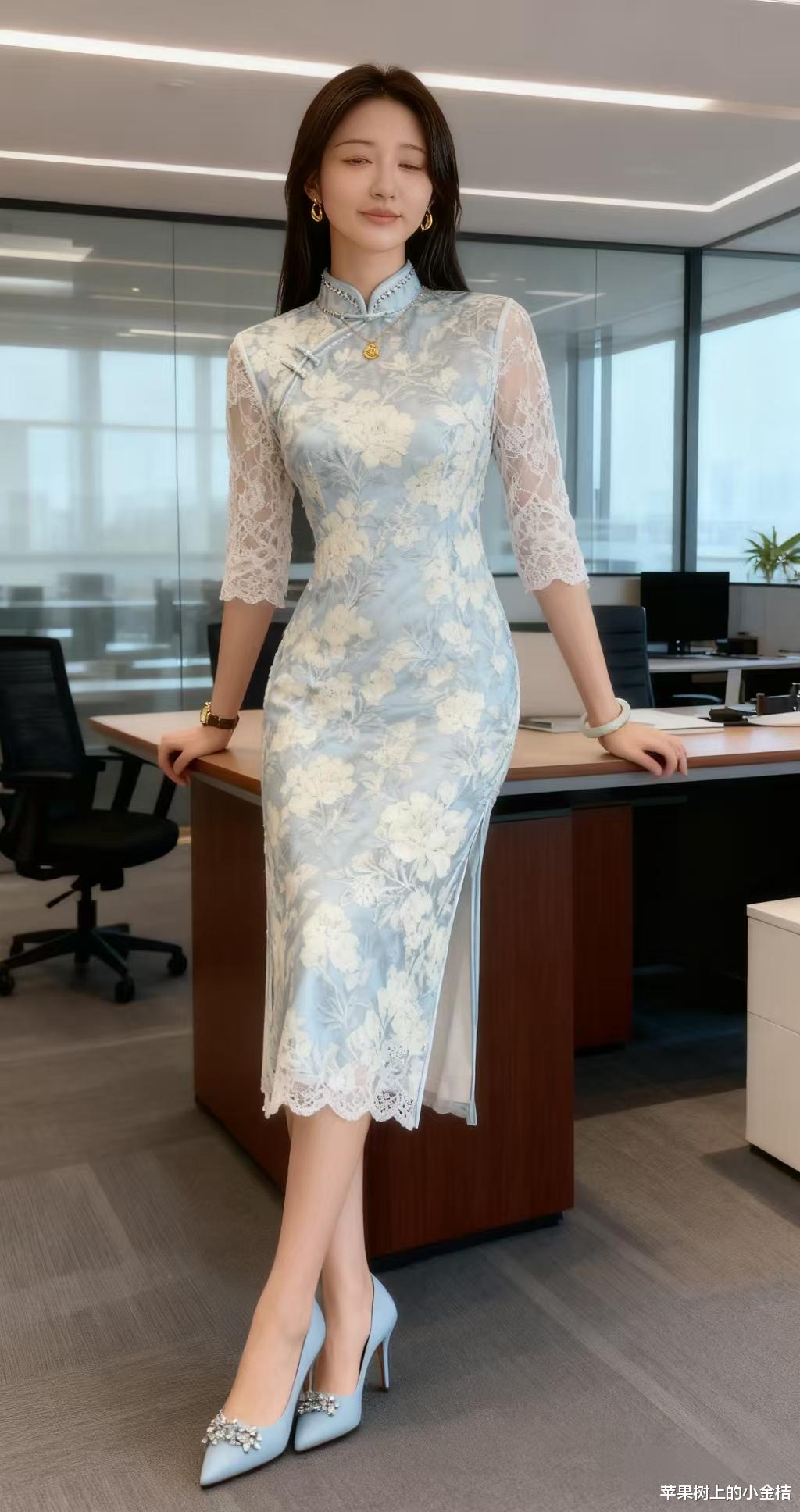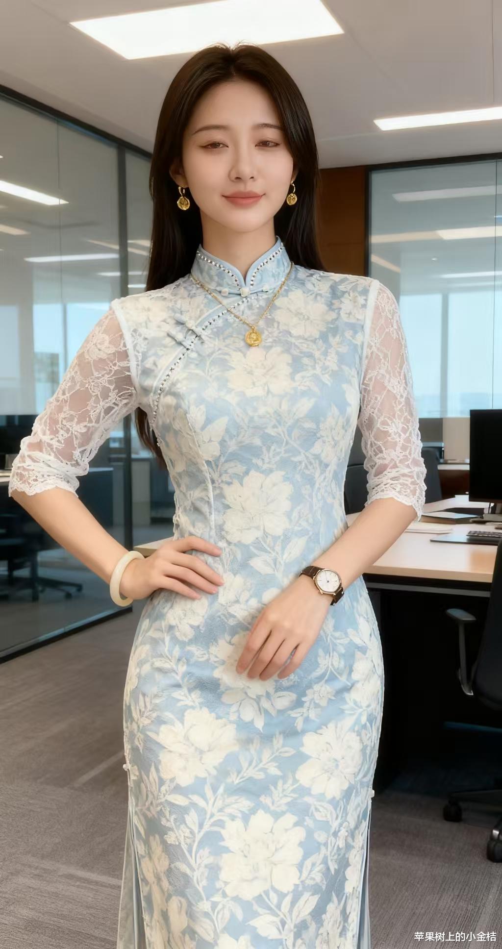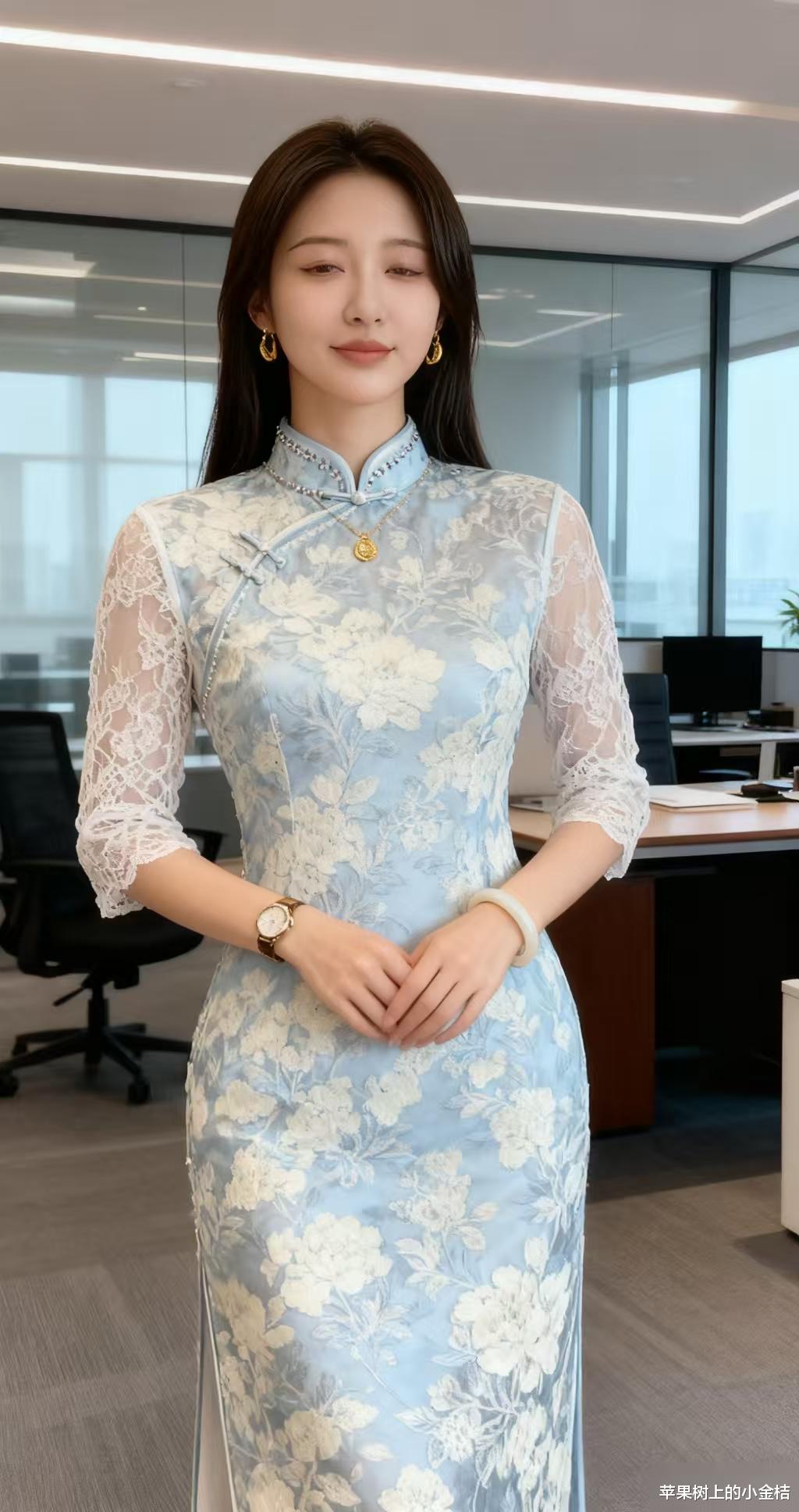 民国风浅蓝米白改良旗袍,古典优雅,精致得体。