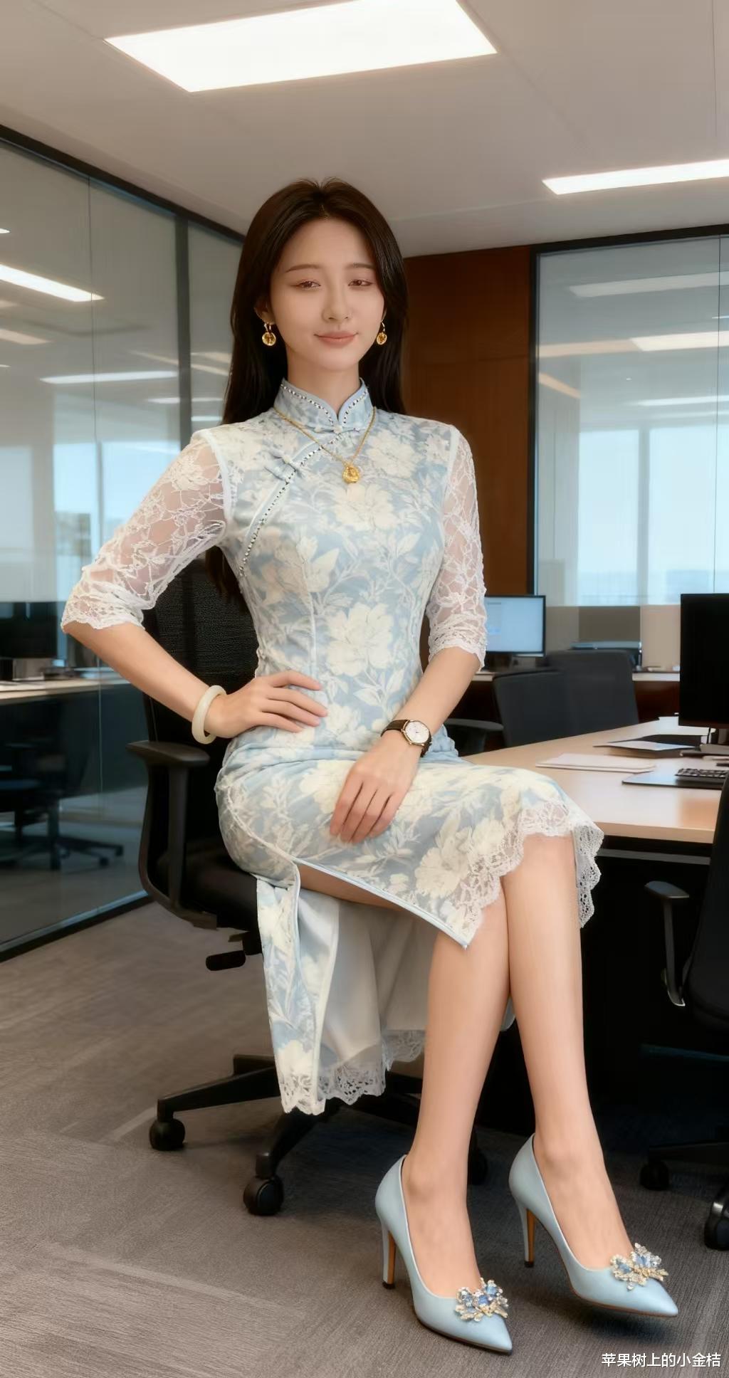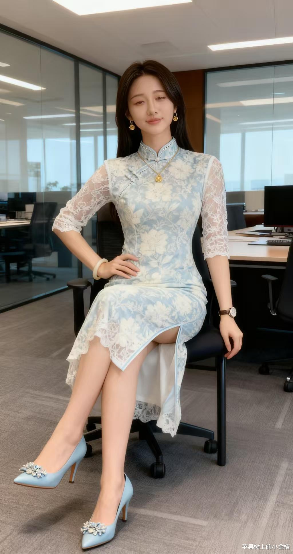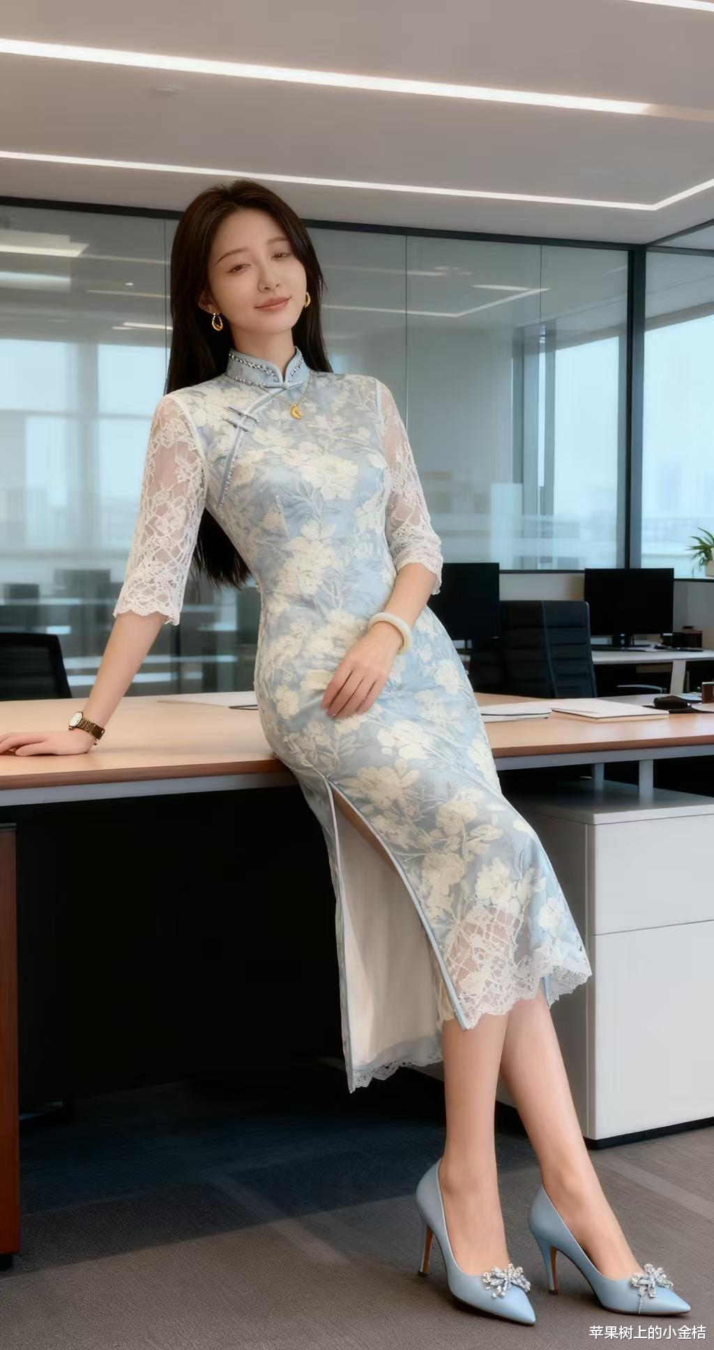 民国风浅蓝米白改良旗袍,古典优雅,精致得体。
