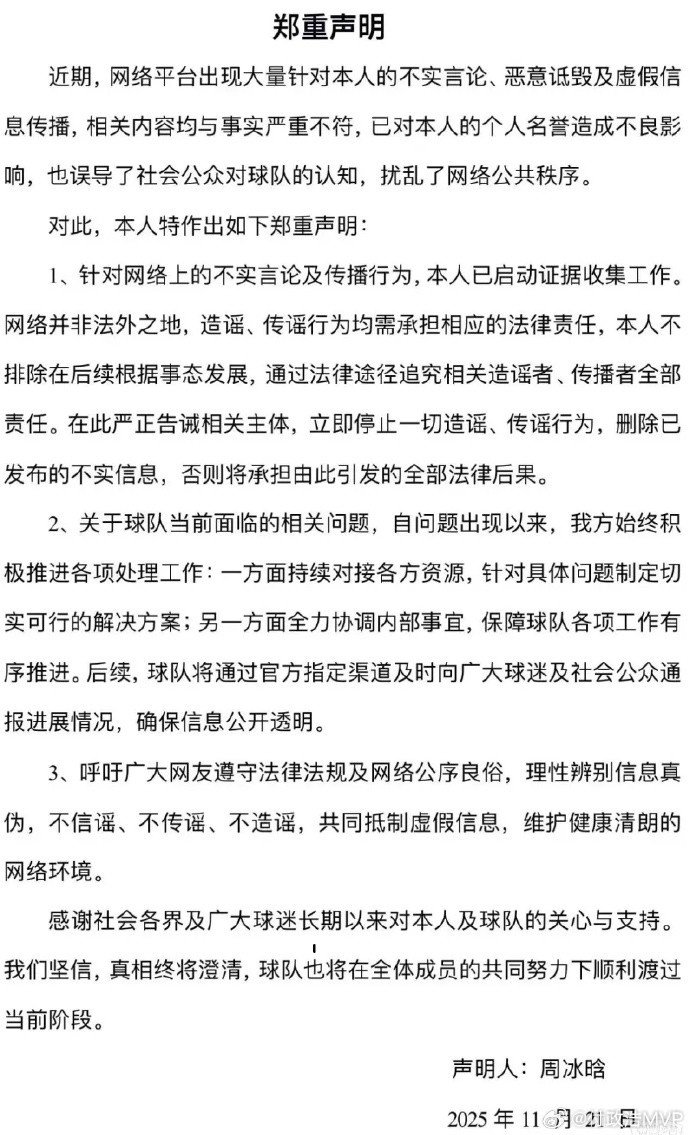 直播吧11月23日讯据媒体人付政浩报道,四川男篮投资人周冰晗最近发了一份声明,驳斥了一些无端猜测和不实传闻,同时表达了仍在全力解决问题、积极对接资源推进问题解决、保障队内工作有序开展的态度。
