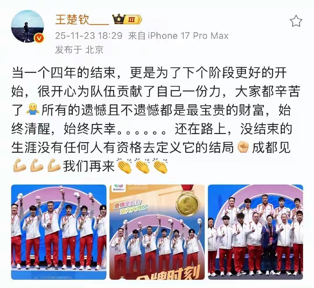 11月23日王楚钦全运会后发文“成都见,我们再来”,这宣言太有劲儿了!全运会乒乓球男团决赛,北京队时隔32年再夺冠,上海队也时隔八年重返领奖台。王楚钦所在上海队一单樊振东超猛,和王楚钦的两场对决都赢了。两人交手34次,樊振东27胜7负占优。而且樊振东全运会个人和团体10场全胜,乒超还有13连胜,国内赛场已23连胜。王楚钦没被眼前胜负打倒,发文说没结束的生涯没人能定义结局,期待他在成都能带来新惊喜! 乒乓王楚钦