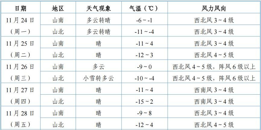 【下周将迎三次降温,最低气温-15℃包头 】未来一周(11月24日至11月30日)我市天气以晴为主,受冷空气影响,周三山北有小雪。下周全市有三次降温天气,周一气温下降6℃~8℃,周四气温下降4℃~6℃,周六气温下降4℃左右。山南气温-11℃~8℃,山北气温-15℃~4℃,周内全市风力偏大,周三山北有扬沙或浮尘。 温馨提示:近期受冷空气影响,天气逐渐转寒,加之风力较大,风寒效应显著,公众出行注意添衣保暖,谨防感冒;同时远离广告牌、临时搭建物等易被风吹动的设施,以防高空坠物。