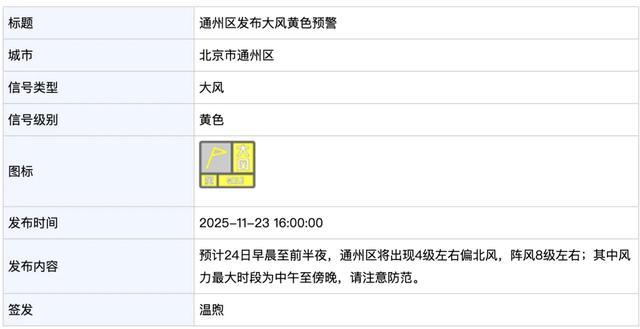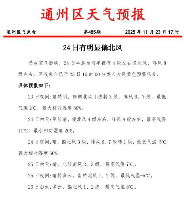 预计明天(24日周一)早晨至前半夜,通州区将出现4级左右偏北风,阵风达8级左右。其中,风力最大时段为中午至傍晚,请注意防范。