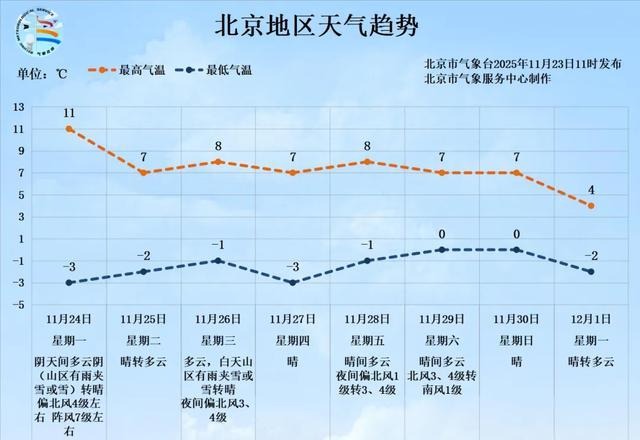 明天(24日周一)至12月1日,白天最高气温4℃-11℃,夜间最低气温-3℃-0℃。