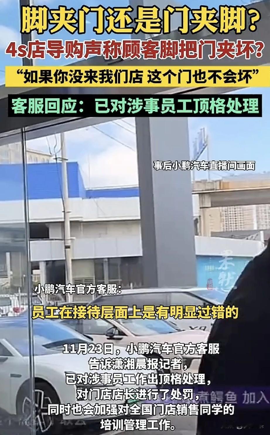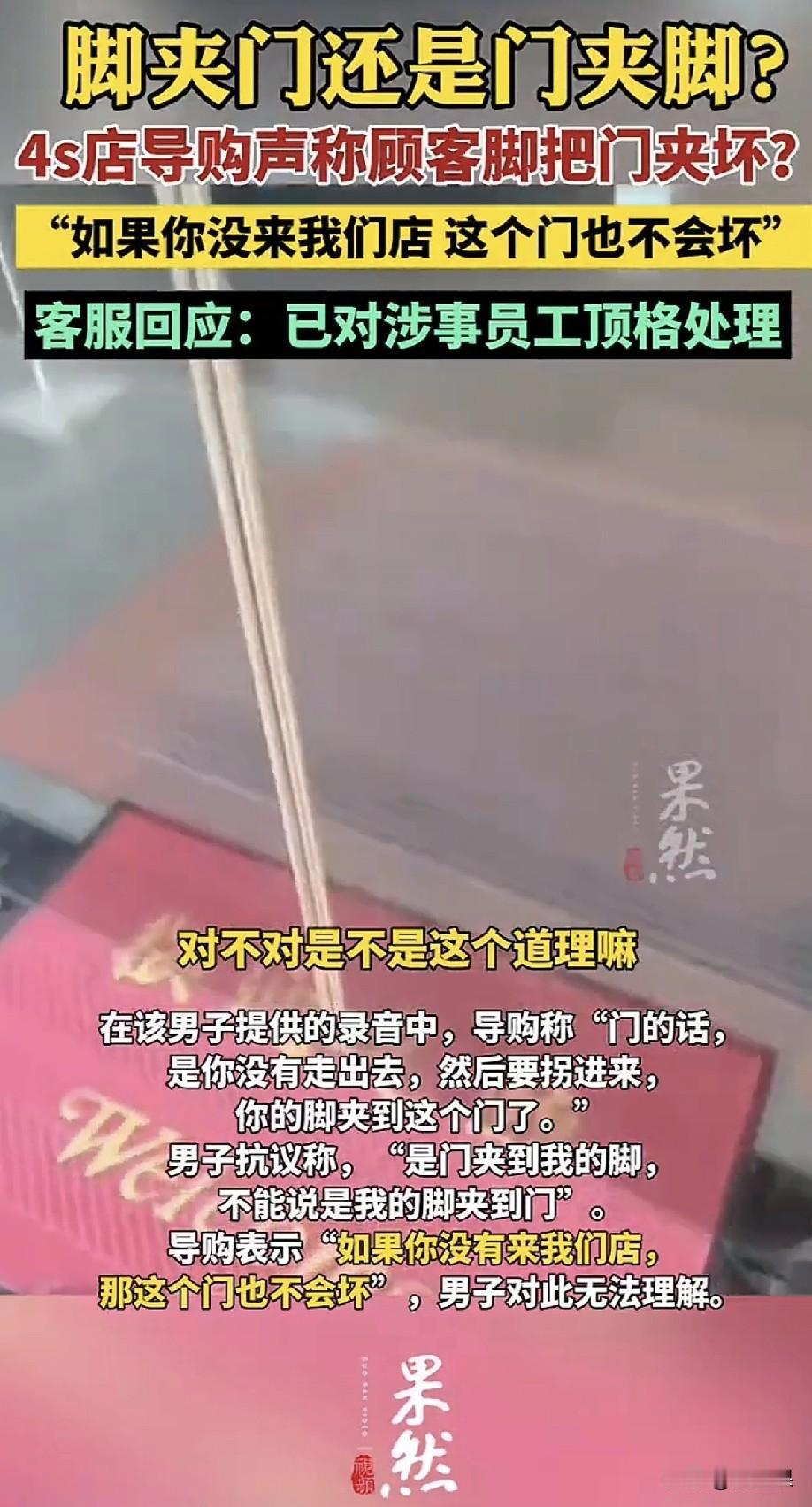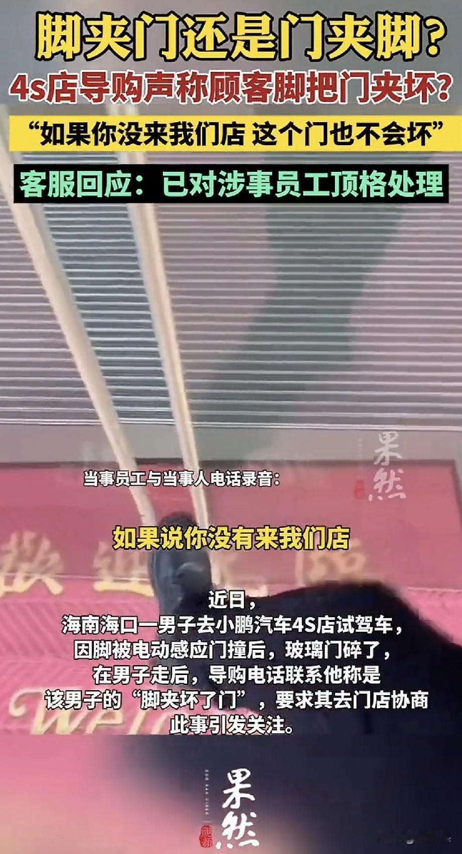 这个小鹏新能源汽车导购员是个傻子。 现在汽车销售竞争多么激烈, 来顾客了,还不好好服务,还把感应门坏了的赖到顾客身上, 你一辆车都卖不出去是对的。 最近海南小鹏汽车销售店,一位男子来看车。 进门的时候,脚被感应门夹了一下,待脚收回,感应门玻璃碎了。 当时没有人说什么,就在男子走后,一名导购员打电话找顾客索赔, 理由是:你不来,感应门也不会坏。正是因为你来了,我们的门才坏的。 说完这句话,还反问顾客一句:你说是不是这个理儿? 什么理?要是我都会气笑了。 这是歪理邪说。 你们干脆关门大吉得了呗,谁来都得担心弄坏你们的门。 男子和媒体记者找小鹏客服反映,客服还算脑子不糊涂,马上给了回应:导购员言行不妥当,已对其做出顶格处理。 我怀疑这位导购员是不是隔壁家的汽车店的卧底啊?带坏小鹏汽车的舆论,是他坚守的使命。