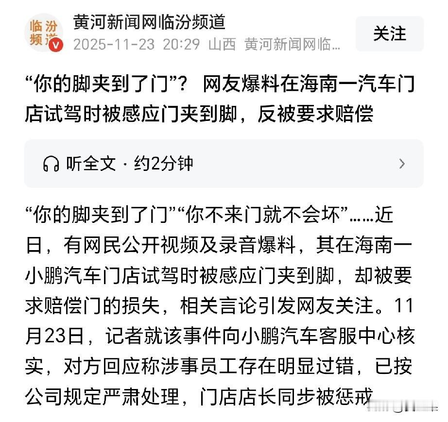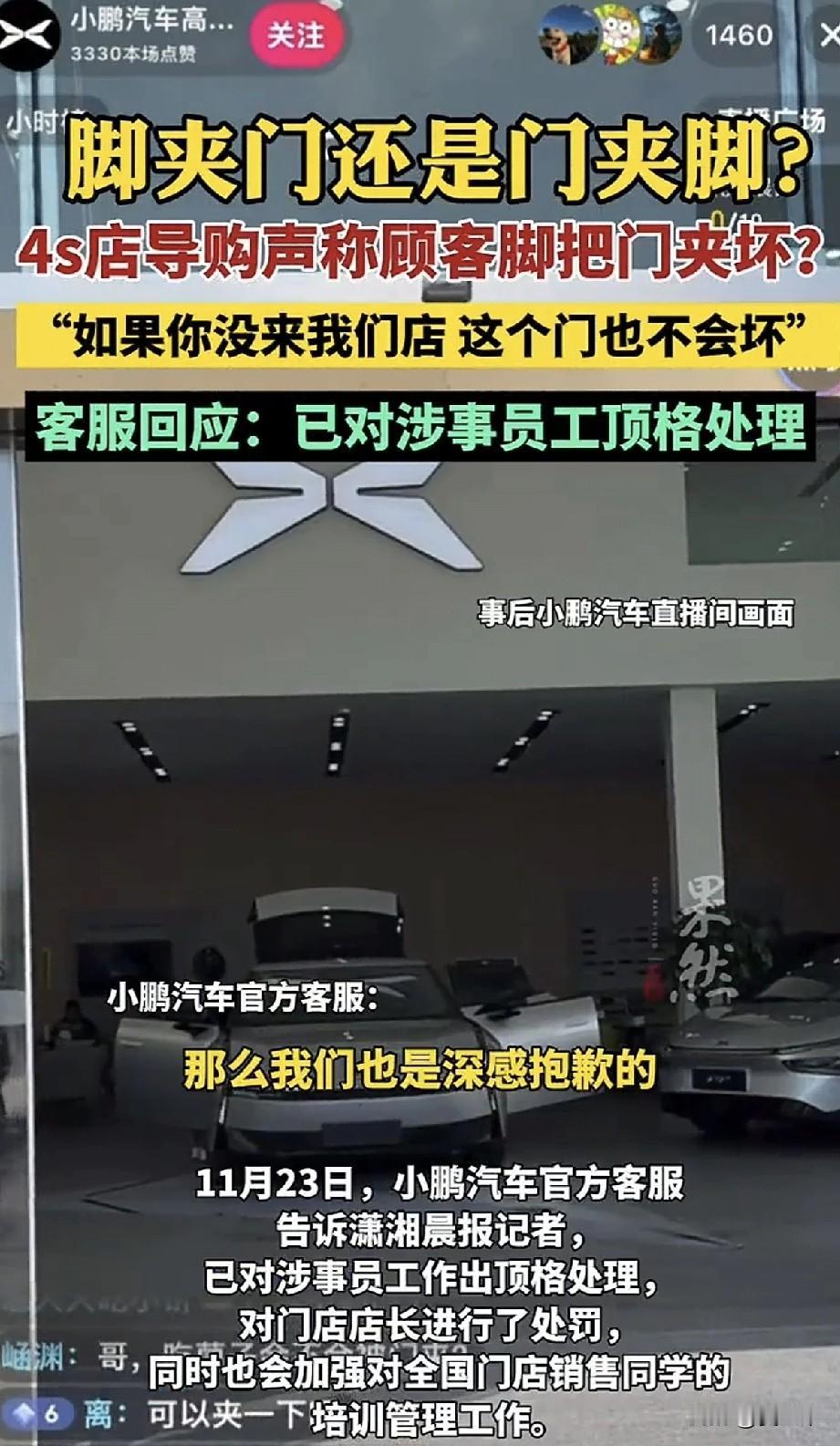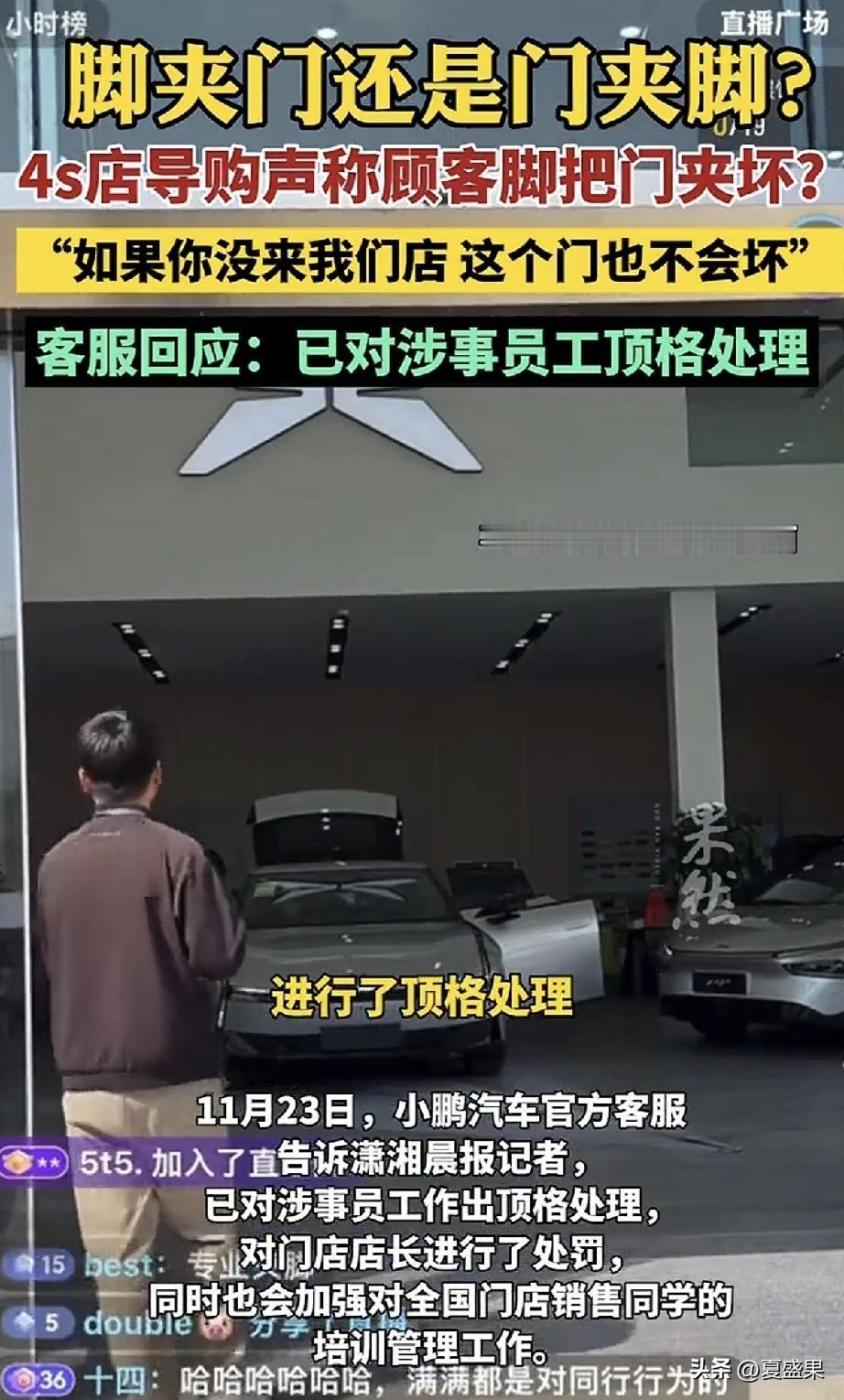 这个小鹏新能源汽车导购员是个傻子。 现在汽车销售竞争多么激烈, 来顾客了,还不好好服务,还把感应门坏了的赖到顾客身上, 你一辆车都卖不出去是对的。 最近海南小鹏汽车销售店,一位男子来看车。 进门的时候,脚被感应门夹了一下,待脚收回,感应门玻璃碎了。 当时没有人说什么,就在男子走后,一名导购员打电话找顾客索赔, 理由是:你不来,感应门也不会坏。正是因为你来了,我们的门才坏的。 说完这句话,还反问顾客一句:你说是不是这个理儿? 什么理?要是我都会气笑了。 这是歪理邪说。 你们干脆关门大吉得了呗,谁来都得担心弄坏你们的门。 男子和媒体记者找小鹏客服反映,客服还算脑子不糊涂,马上给了回应:导购员言行不妥当,已对其做出顶格处理。 我怀疑这位导购员是不是隔壁家的汽车店的卧底啊?带坏小鹏汽车的舆论,是他坚守的使命。