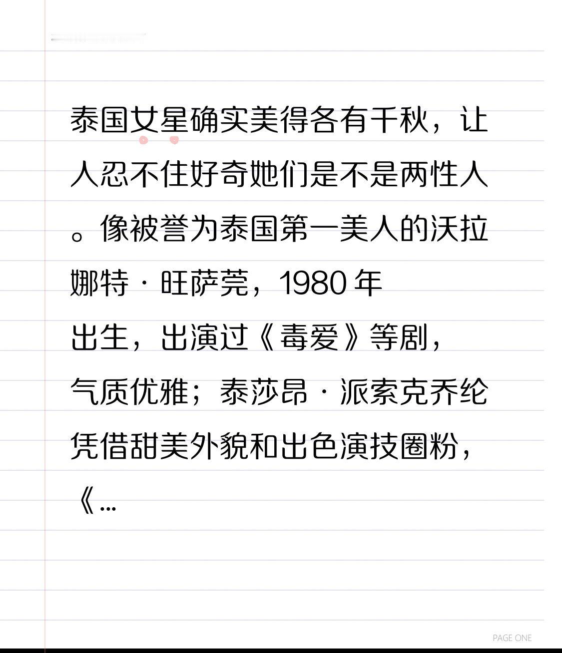 泰国女星确实美得各有千秋,让人忍不住好奇她们是不是两性人。像被誉为泰国第一美人的沃拉娜特·旺萨莞,1980 年出生,出演过《毒爱》等剧,气质优雅;泰莎昂·派索克乔纶凭借甜美外貌和出色演技圈粉,《爱的被告》让人印象深刻。 不过,不能仅凭外貌就怀疑人家是两性人。泰国虽然有一些人妖群体以美貌著称,但大多数女星都是天生的女性。比如黛薇卡·霍内,泰国比利时混血,颜值超高,2025 年到中国拍《冰湖重生》,古装扮相惊艳众人。我们还是该用欣赏的眼光看待她们的美。