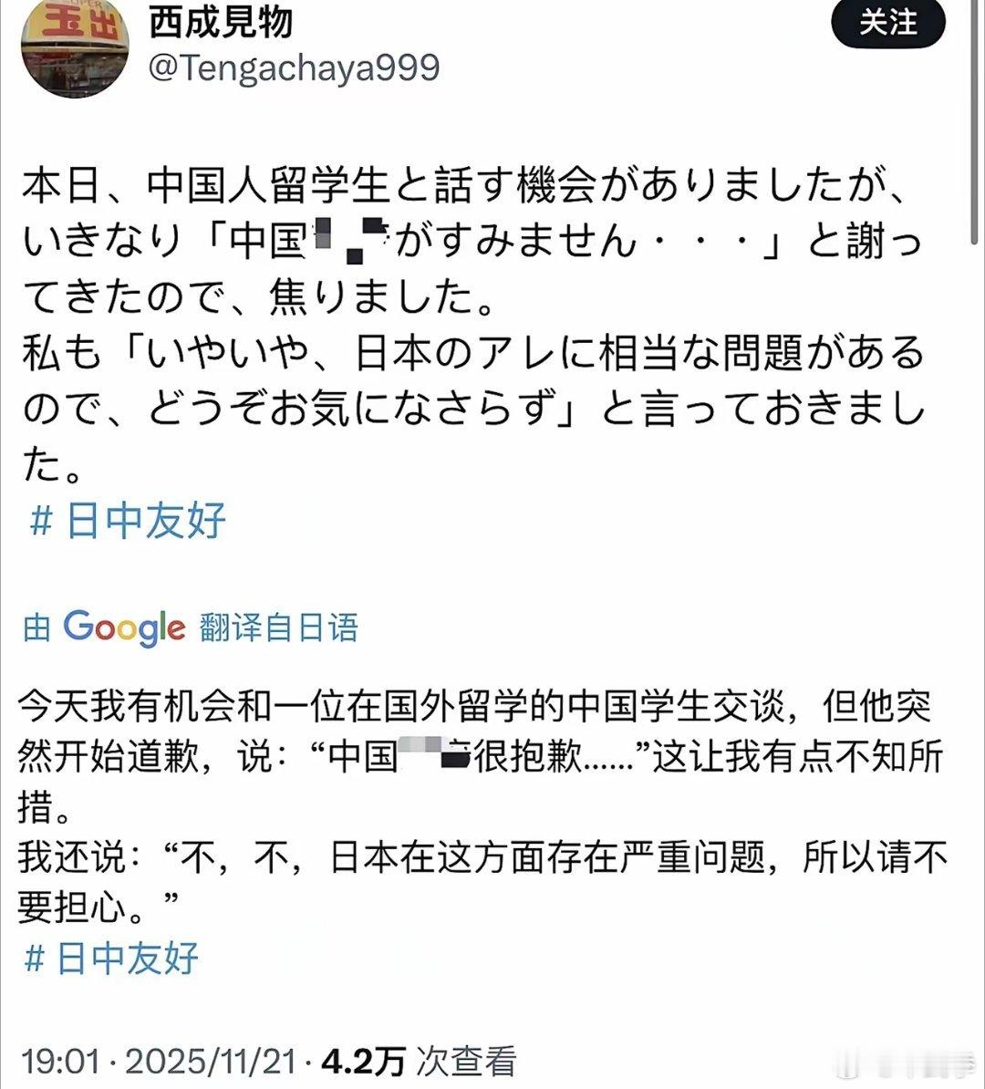 一位日本网友发文称,有一个中国留学生因为近期中日摩擦找他道歉,对此这个日本人还安慰这个中国留学生:“不是你们的问题,是我们日本自己的问题。” 学日语的就服从日本,研究日本的就成为精日。相比较,日本人学中文的,都是在研究如何打败中国,研究中国历史的,都想着如何分裂中国。 同样的行为,为何差距黑白分明天差地别?