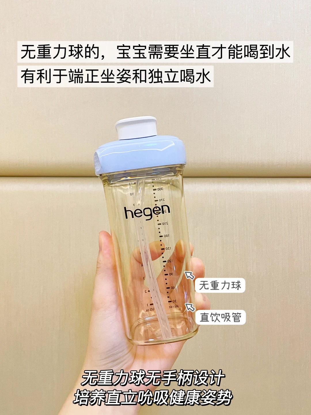 🔹hegen无重力球的设计,让宝宝就会本能的端正坐姿来喝,每次我家弟弟喝的时候都坐得直直乖乖的,莫名正经得可爱哈哈😆~而其他吸管杯,因为有重力球的作用,很多宝宝喝水的时候就会东倒西歪的随意喝,没有培养很好的自主进食习惯,另外重力球还容易藏污纳垢滋生细菌,没有办法彻底清洁到位。