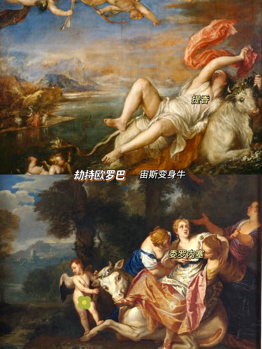 🐮这种简单粗暴的劫掠还发生在腓尼基公主欧罗巴身上,这回宙斯变成了一头牛,引诱欧罗巴爬上他的背,头也不回的飞奔而去,这一题材最著名的画作来自提香,鲁本斯也曾临摹过。