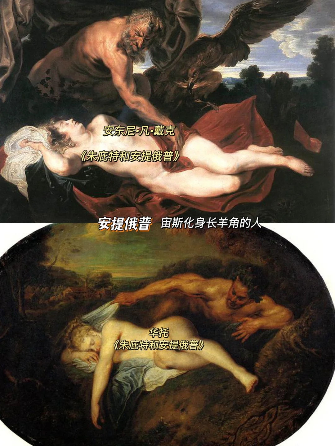 🐏有时,他会变成长着羊角的人,在凡.戴克、华托等人的作品中,他正在靠近树下熟睡的女孩儿,那是底比斯国王的女儿安提俄珀,后来,她生下了一对孪生兄弟。