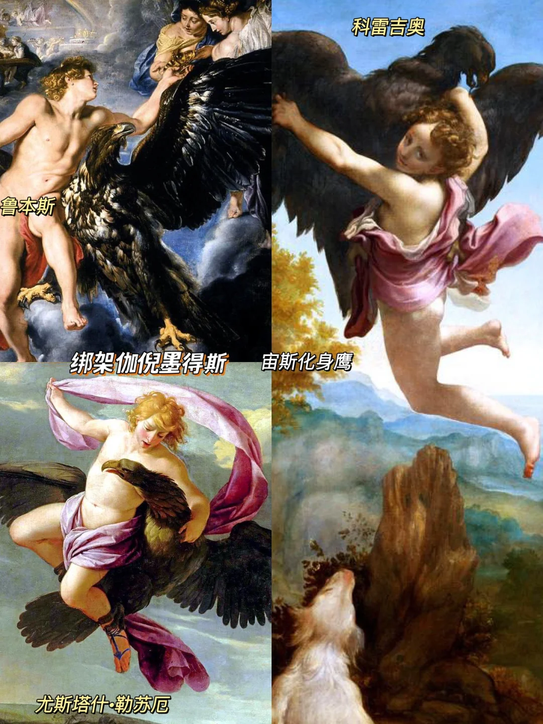👦宙斯也用同样的方法将盖尼米得带上奥林匹斯山做侍酒童。不同处在于,这位是个美少年,最后因为赫拉的嫉妒,被升上天空成为了♒️水瓶座。关于他,最经典的画作要属科雷吉奥的《朱庇特的爱-伽倪墨得斯》了。