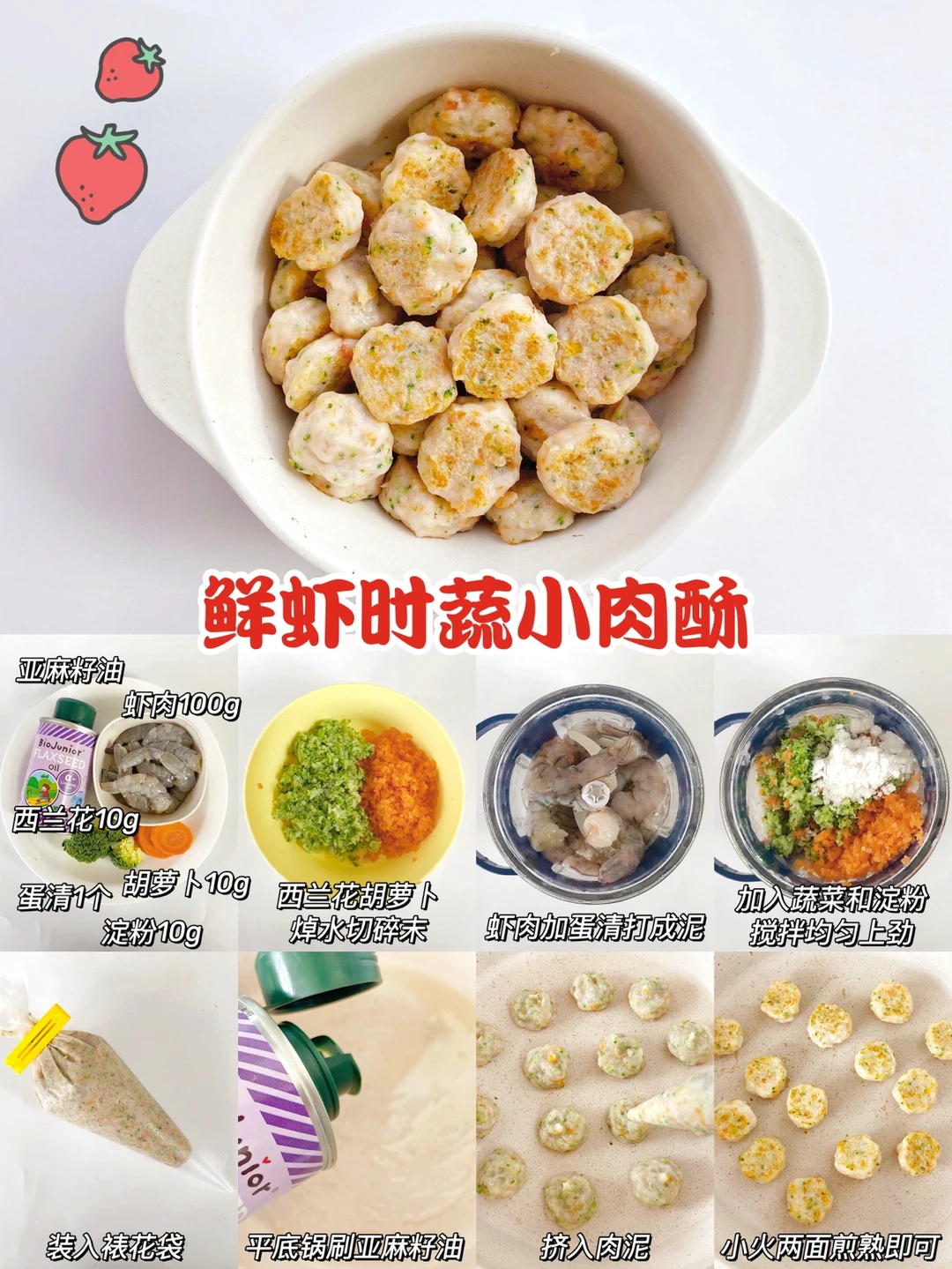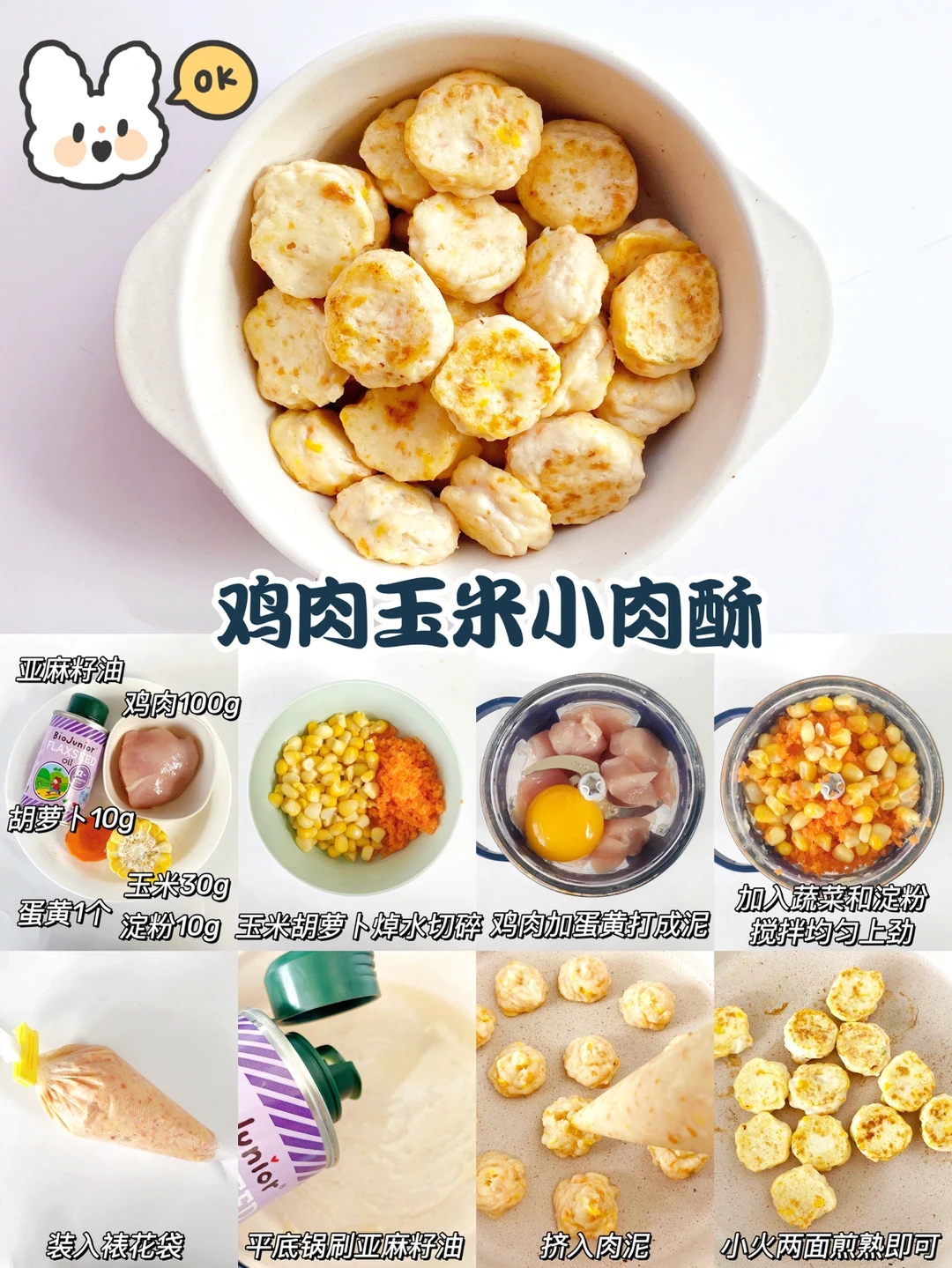 肉类100g+蛋清1个/蛋黄1个+蔬菜10-20g+玉米淀粉10g