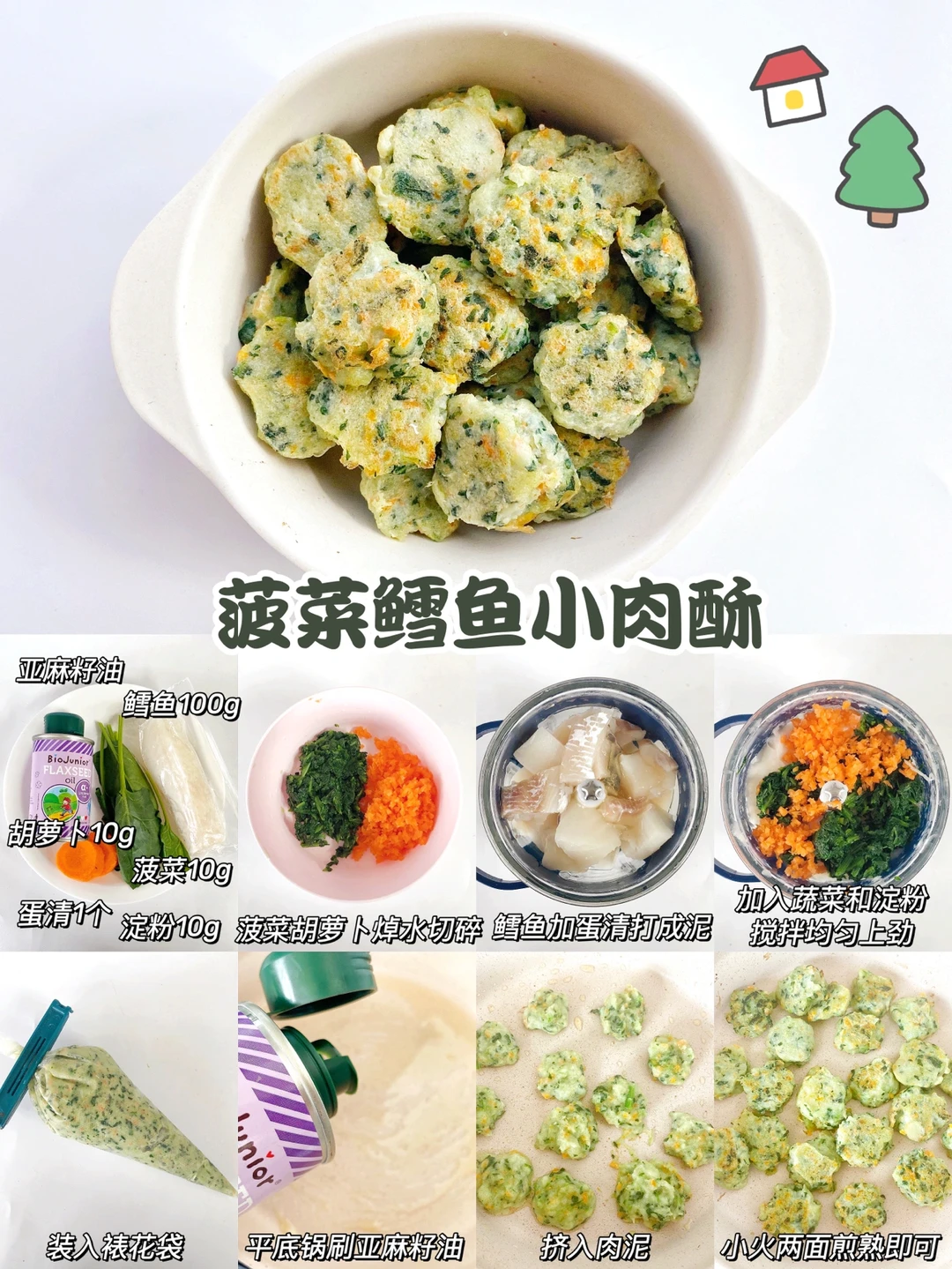 鳕鱼、菠菜、胡萝卜、淀粉、蛋清、碧欧奇亚麻籽油