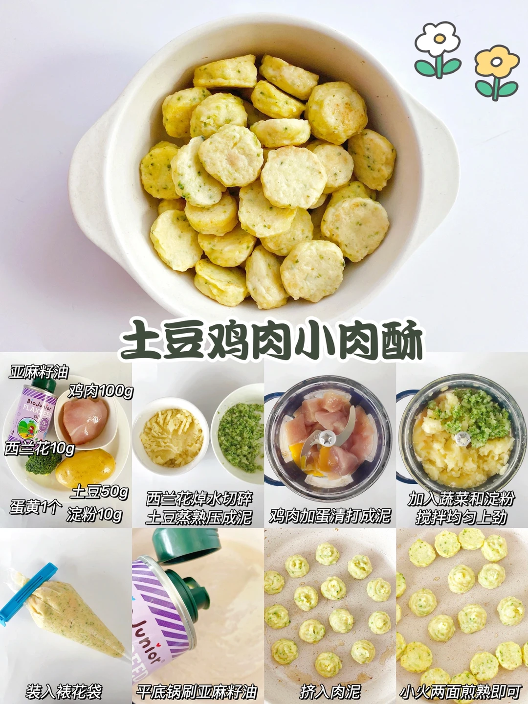 鸡肉、土豆、西蓝花、淀粉、蛋黄、碧欧奇亚麻籽油